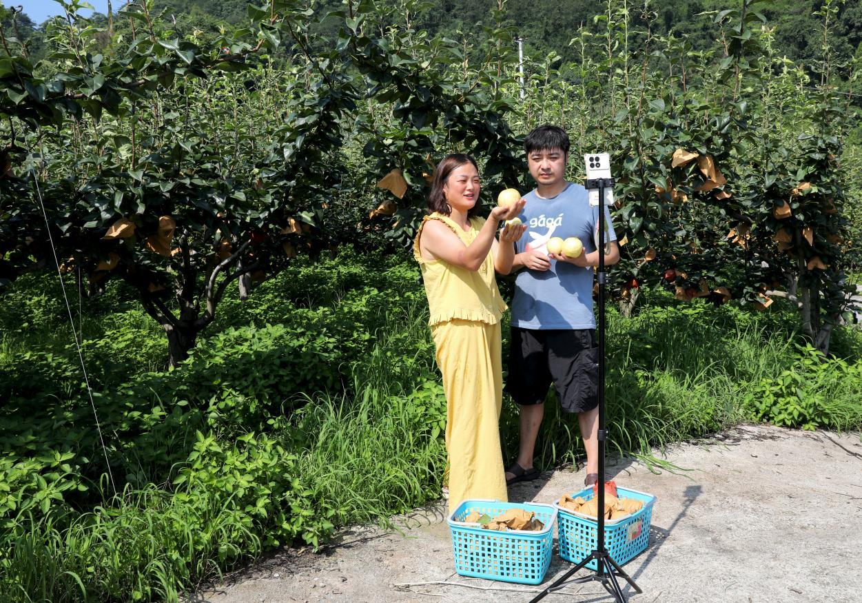 7月16日,业主和网红在广安区龙安乡勇敢村大云山金太阳果园通过直播的方式向网友展示雪梨。