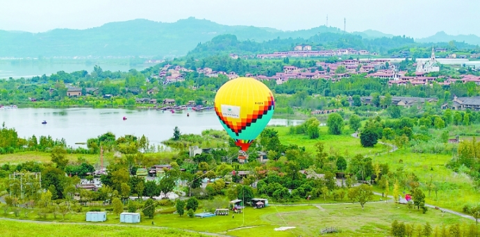 在凤仪湾国际飞行营地,低空文旅热度持续攀升。笔者近日在此看到,经过安全人员细致检查后,滑翔伞爱好者依次奔跑起跳,乘风翱翔于天际,俯瞰嘉陵江蜿蜒流转,将两岸湿地芦苇荡、田园村落尽收眼底;色彩斑斓的热气球缓缓升空,载着游客在百米高空领略生态之美,欢呼声与快门声此起彼伏。