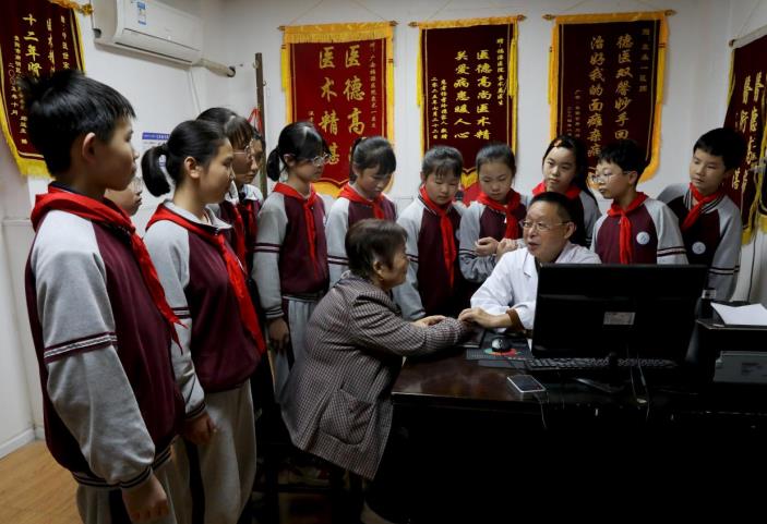 11月6日,四川省广安市广安区富源小学校学生在福源医院中医科观摩老中医把脉问诊,沉浸式感受传统中医的魅力。