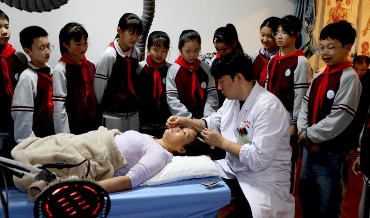 11月6日,广安区富源小学校学生在福源医院中医科观摩扎银针。