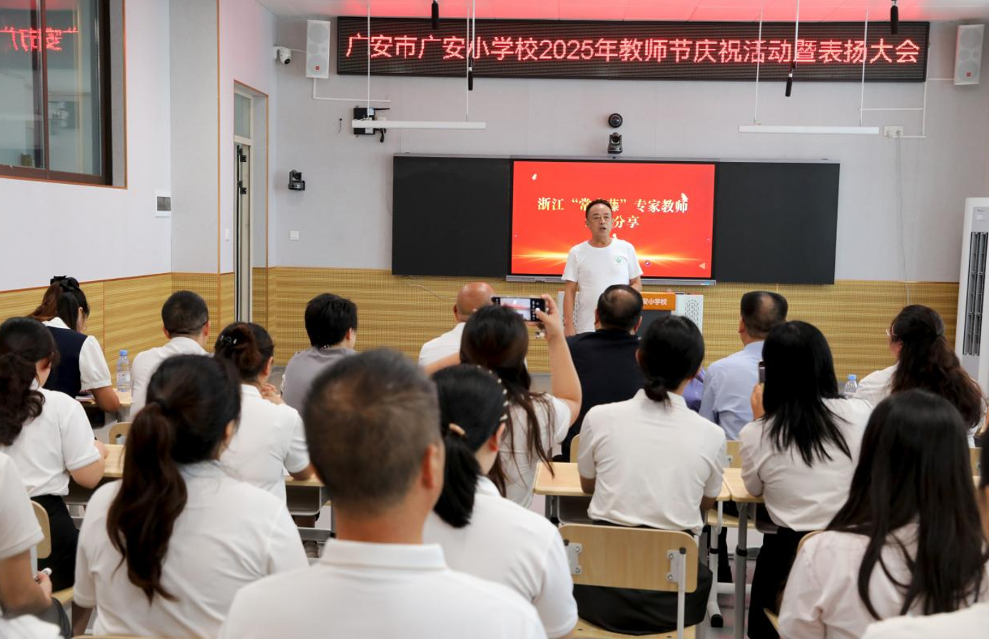 "值此教师节之际,我想作为一个老教师,给全体在职教师分享我自己在教育生涯当中的点滴体会,我觉得教师这个职业应该做好三个字。第一个是要有爱心,对每一位学生不放弃;二是要有责任心,规划我们的职业生涯,上好每一堂课;第三个要付诸于我们自己的实际行动中去,做到'行',要践行教师的职业操守和规范。"9月9日下午,四川省广安小学校会议室里,桂花清香透过窗隙弥漫,庆祝教师节大会正在举行。来自浙江的"常青藤"计划支教老师吕伯海,满脸笑意地向着年轻老师分享自己的教育经验。