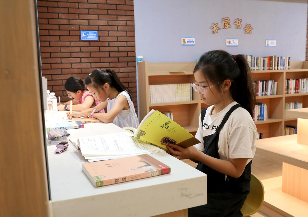 7月6日,小学生在四川省广安市广安区广福街道望江社区思源书屋休闲阅读区浏览图书。