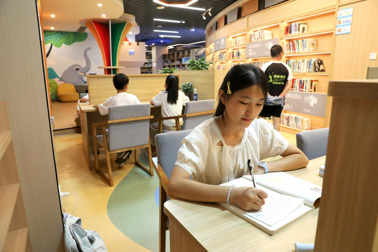 7月6日,孩子们在四川省广安市广安区广福街道望江社区思源书屋休闲阅读区浏览图书和完成暑假作业。(沈仁平 廖小兵)