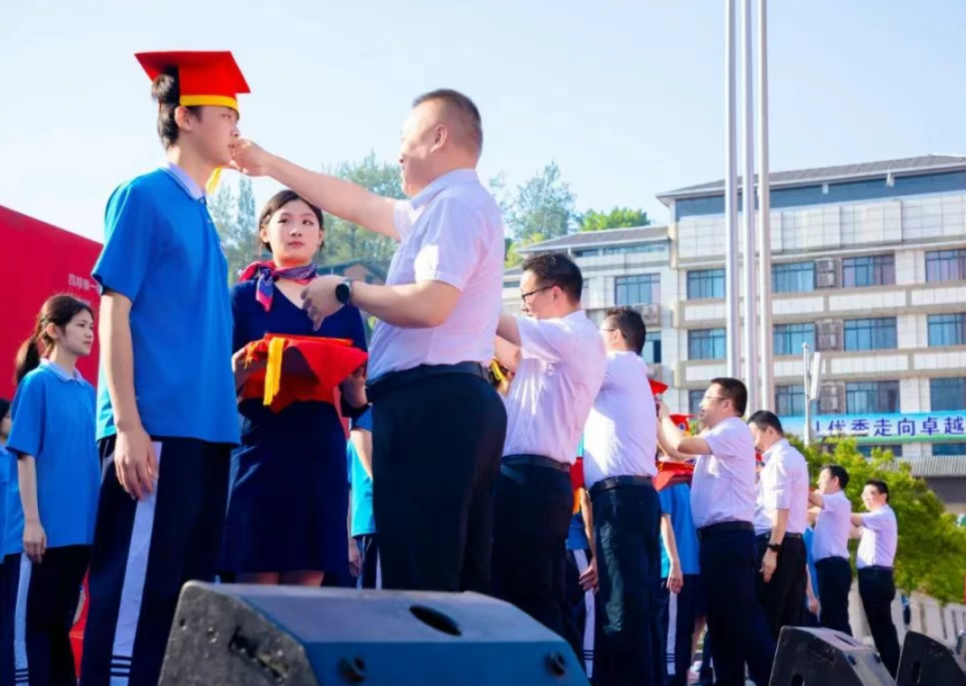 学校党委书记谯小波向学生代表赠送《宪法读本》,指尖触碰烫金封面的瞬间,使命感在胸腔轰鸣。当法治的阳光照亮十八岁的征程,同学们终将明白——真正的成熟,是心中有戒尺,眼中有光芒,脚下有方向。校领导、班主任与成长导师为学生加冠,家长给孩子送上精心准备的成年礼物,孩子对家长三鞠躬,表达对父母养育之恩的诚挚谢意,并通过“爱要大声说出来”环节将孩子们潜藏在内心的爱意宣之于口。在互读家书环节,许多家长轻抚孩子的肩膀,眼中泪光闪烁;许多同学展开信纸,字句未读,泪水已模糊视线。那些平日里羞于言说的爱与感恩,都化作此刻的热泪盈眶,让心与心跨越时光,紧紧相拥。