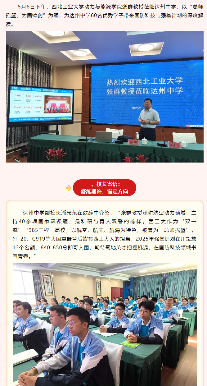 播撒三航火种 共育强国栋梁——西北工业大学张群教授到达州中学宣讲