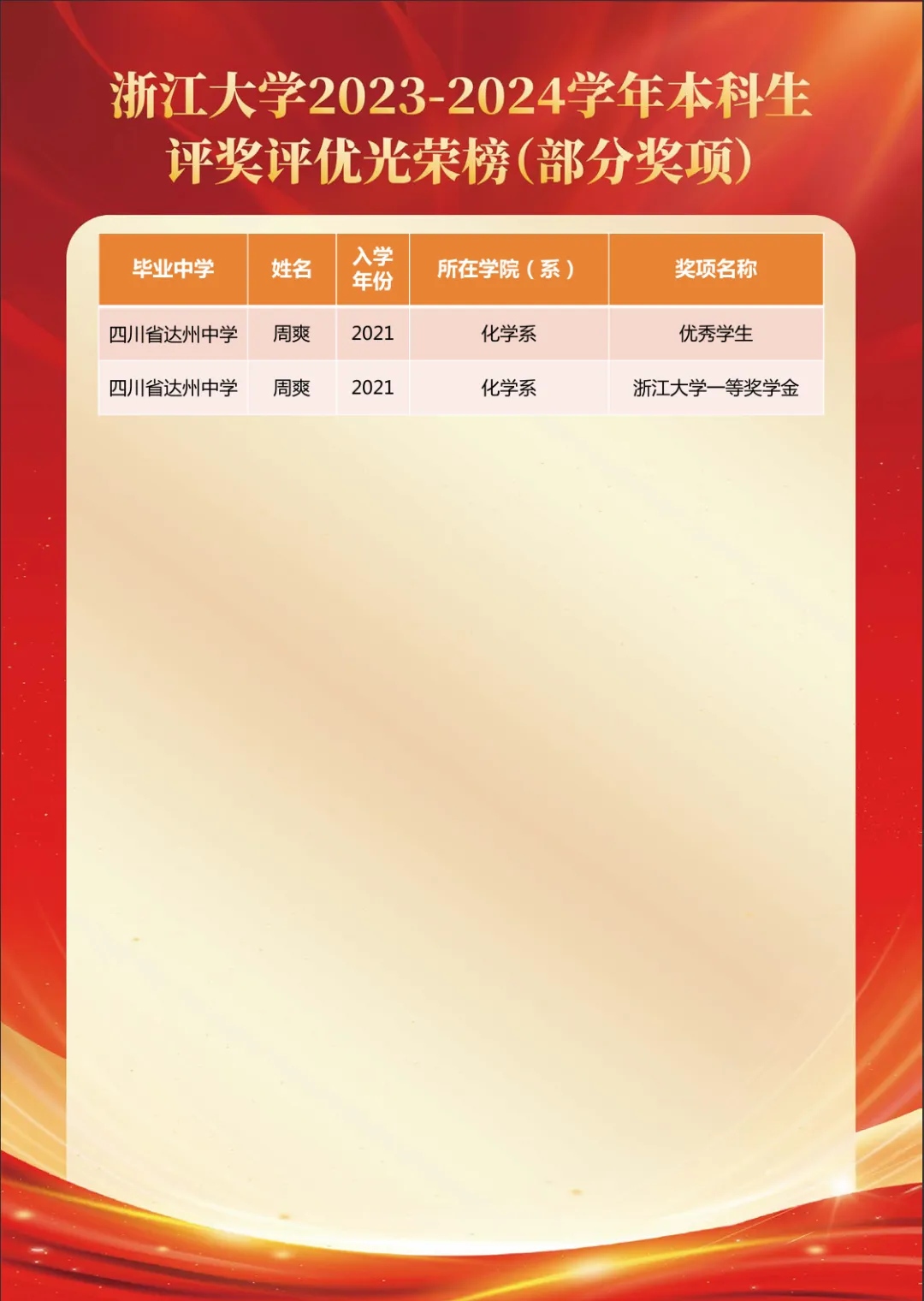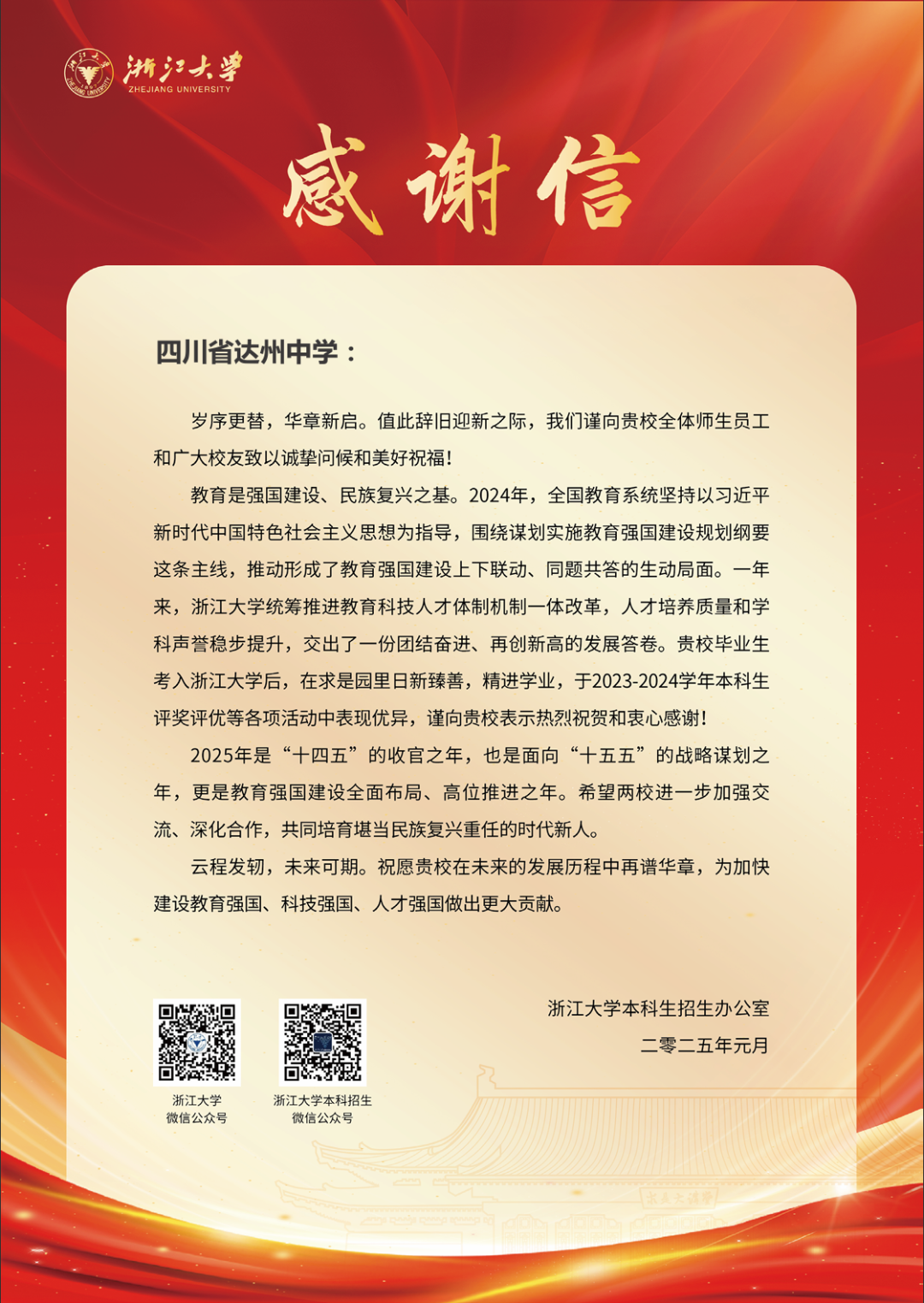 祥龙摆尾辞旧岁,金蛇翘首迎新春。新年伊始,浙江大学向四川省达州中学全体师生员工与广大校友致以最诚挚的问候和最美好的祝愿!祝贺达州中学2021级优秀学子周爽在浙江大学求学期间只争朝夕、不负韶华,取得了优异成绩,实现了卓越发展,是两校共同的荣誉和骄傲。