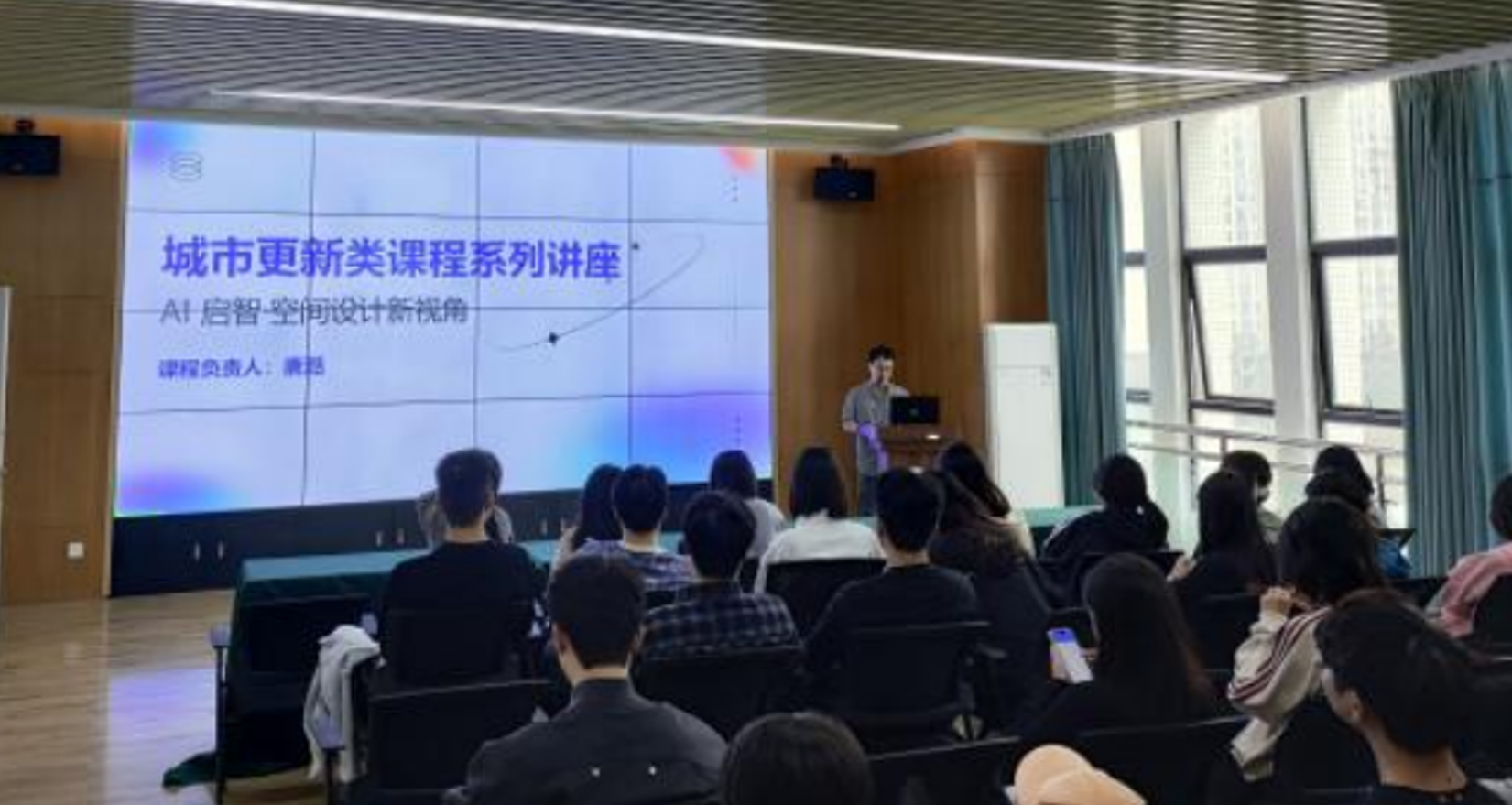 唐湉老师主持讲座开场,她就人工智能领域的发展历史做了详细概述,也阐述了空间设计过程中AI介入的新视角与必要性。随后,任峻平总监围绕“AI时代的创新设计视角”为主题展开演讲。任峻平总监首先讲述了AI工作逻辑与更迭原理,让同学们对这一新兴技术有了更清晰的认识。他结合实际工作案例,直观地向同学们展示了 AI工具在设计需求分析、概念构思、方案深化以及设计定稿的全过程中如何辅助设计师高效工作。此外,任总监还现场演示了 AI工具与 PS、SketchUp 等同学们熟知的设计工具进行实时交互应用的过程,让同学们亲眼目睹了在提高效率的同时获得更好设计效果的实例。任老师强调,未来的设计工作不仅是对设计技能的考验,更是对学习能力持续性的考验。面对新的信息技术革命,大家应以更开放的姿态去探索更多可能,时刻关注新技术的动向。