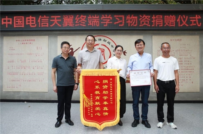 随后,资中县教育基金会、铁佛镇铁佛中心学校领导依次发言,真挚感谢并高度赞扬中国电信的社会责任担当,表示此次捐赠对推动全社会关爱乡村教育起到了一定的示范引领作用,未来将以优异的成绩,报答社会各界的关怀。现场双方进行了捐赠物品的交接,受赠方为捐赠方颁发了证书、锦旗。