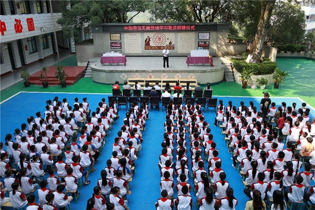 除了精神方面的滋养,心系天下团队也同步为孩子们提供了学习物资的支持。在本次捐赠仪式上,心系天下团队为铁佛中心学校捐赠了中国电信自主研发的AI便携式学习机和天翼云平板电脑各50台,希望乡村孩子也能享有和城市孩子一样的便捷学习工具,通过AI技术加持,畅享海量教育资源,掌握系统学习方法,全方位提升学习兴趣和能力。