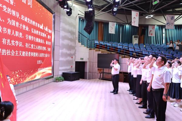 不忘初心,方可行稳致远;牢记使命,更求守正创新。面对新时代的挑战,如何交好教书育人的时代答卷,是我们每位教师必须深思的问题。全体教师要牢记“为党育人、为国育才”的初心和使命,树立躬耕教坛、强国有我的志向和抱负,大力弘扬教育家精神,在李渝书记的带领下,全体教师进行了庄严宣誓。“………为培养德智体美劳全面发展的社会主义建设者和接班人而努力奋斗!”老师们响亮的声音回响在和悦厅上空,像那梦想起航的号角。