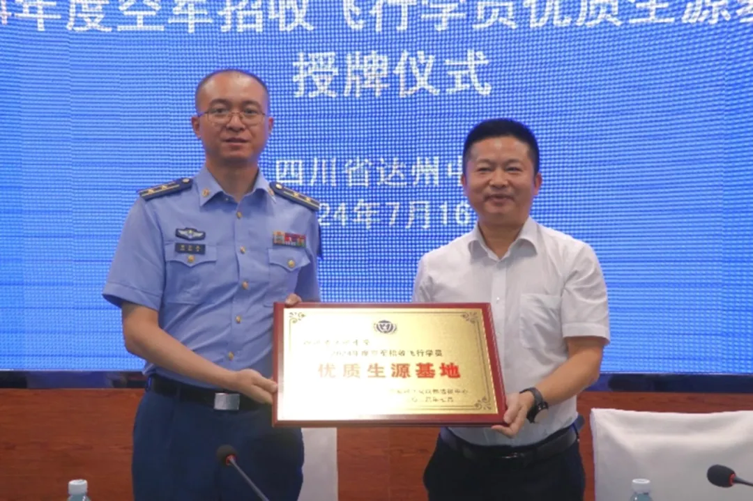 7月16日,成都招飞中心2024年度空军招收飞行学员优质生源基地校授牌仪式在达州中学举行。成都招飞中心相关负责人,达州中学主要负责人、老师,空军航空大学录取的三名学员生及家长等参加授牌仪式。