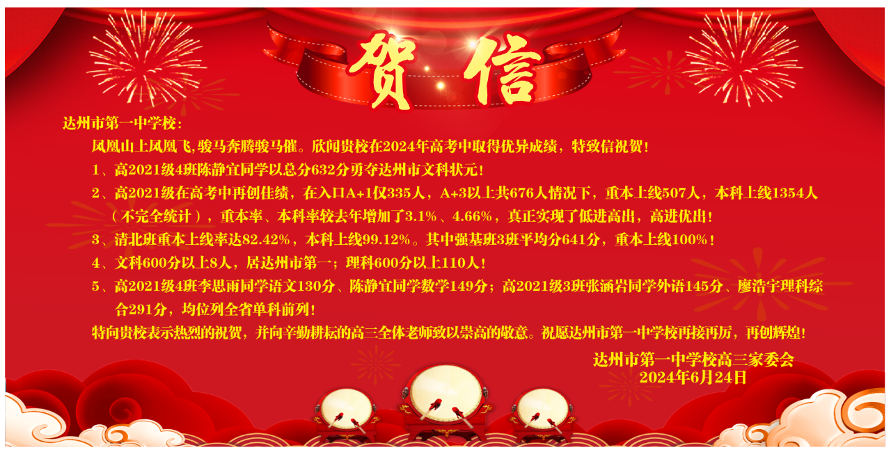 随着2024年四川省高考成绩的公布,我校再传捷报!在此,我们向高2021级同学表示热烈的祝贺,并向辛勤付出的老师们表示衷心的感谢!