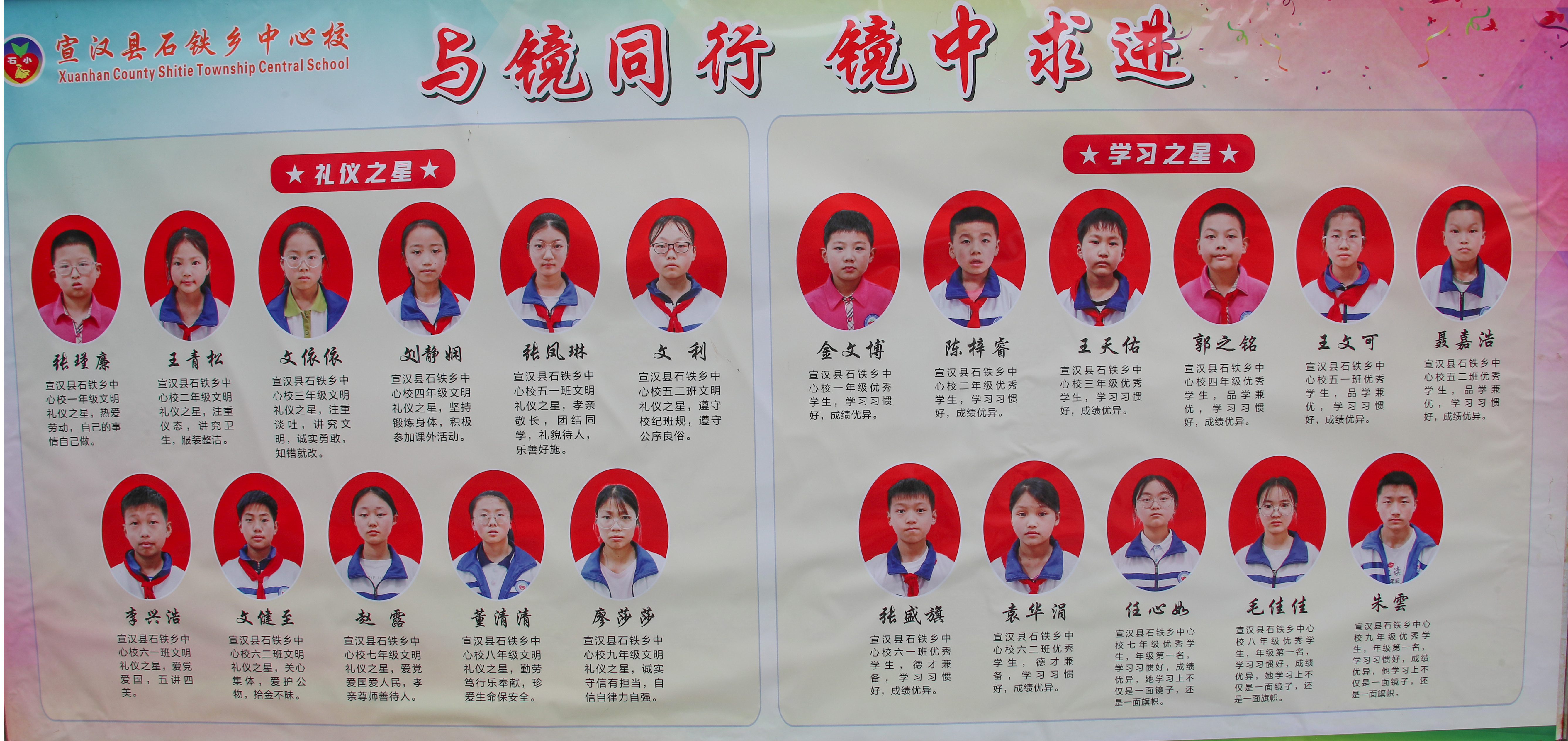 “学生以身边优秀学生为镜子,从仪表谈吐、遵章守纪、勤奋好学等方面,每月以习作方式镜鉴学优,并将优秀作品选送校园之声广播站……”学校专职副书记文宁介绍道,“为了让学生找到身边学习的榜样,学校每学期综合评选‘礼仪之星、学习之星、教坛之星’,并在学校‘光荣榜’上公示。”