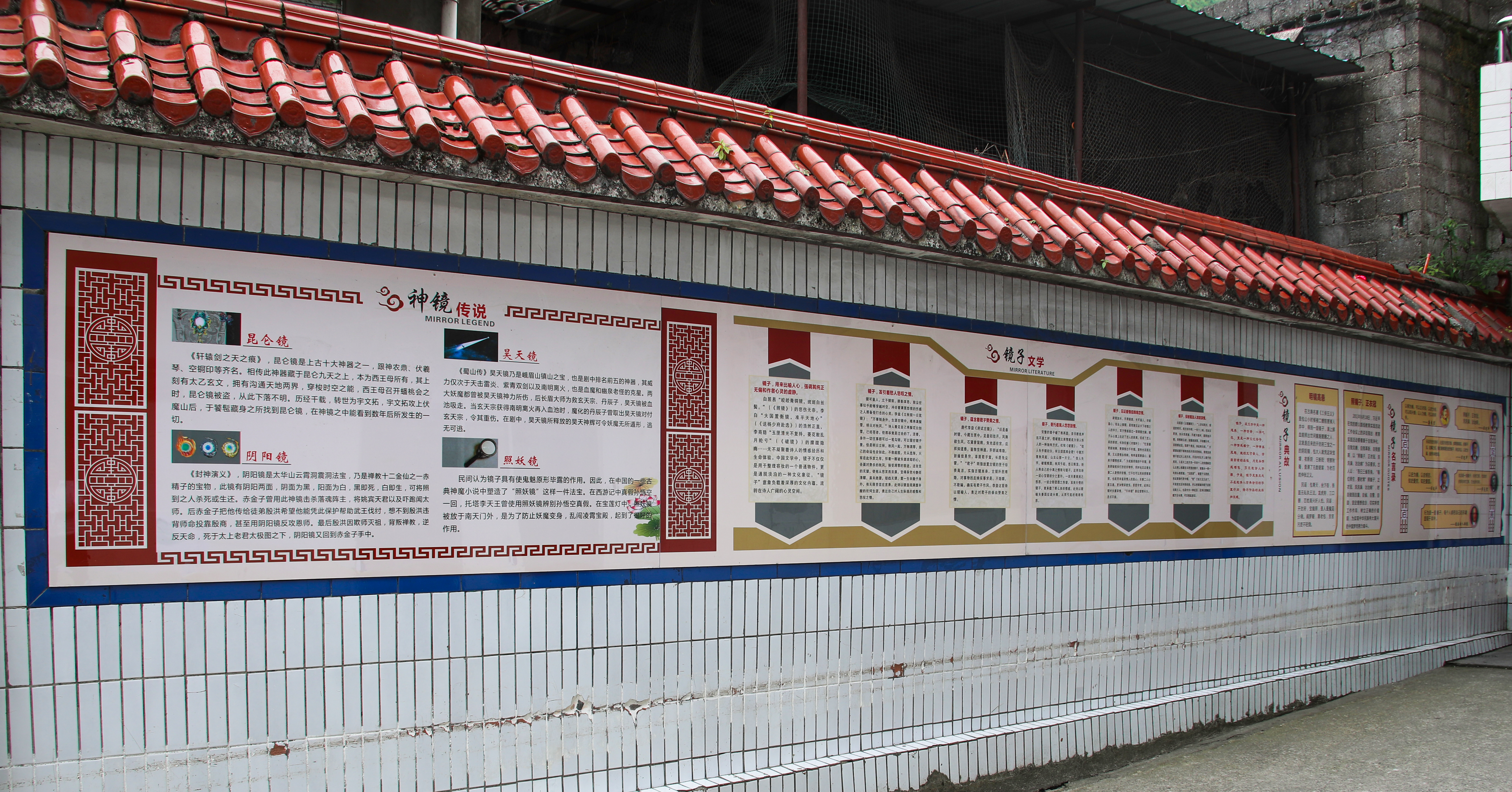 爬上十余级台阶,校园围墙上有镜苑、镜廊展。“镜苑”展现着多面明镜,纹饰华美,各具特色,根据镜子的发展历程,陈列着不同时期“镜”的代表,并附有详细的介绍,可谓丰富多彩。“镜廊”展示了师生优秀作品、感人事迹,让人叹为观止。