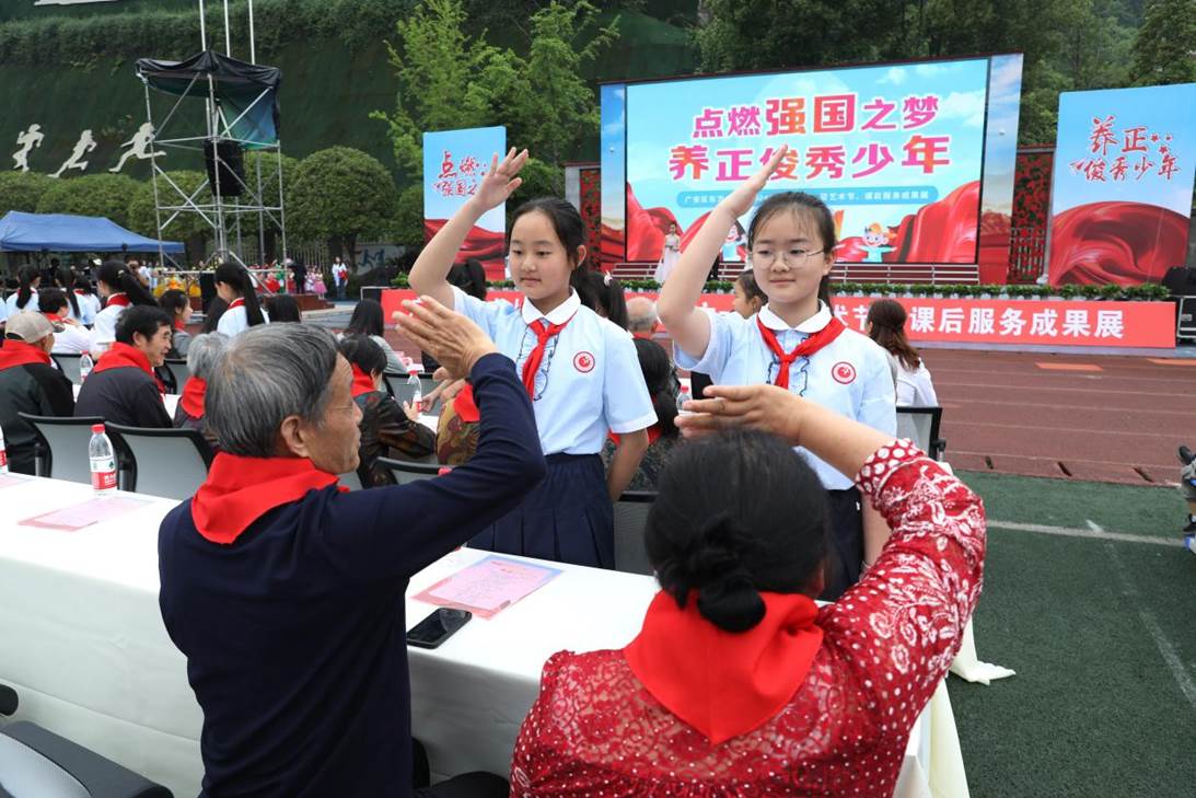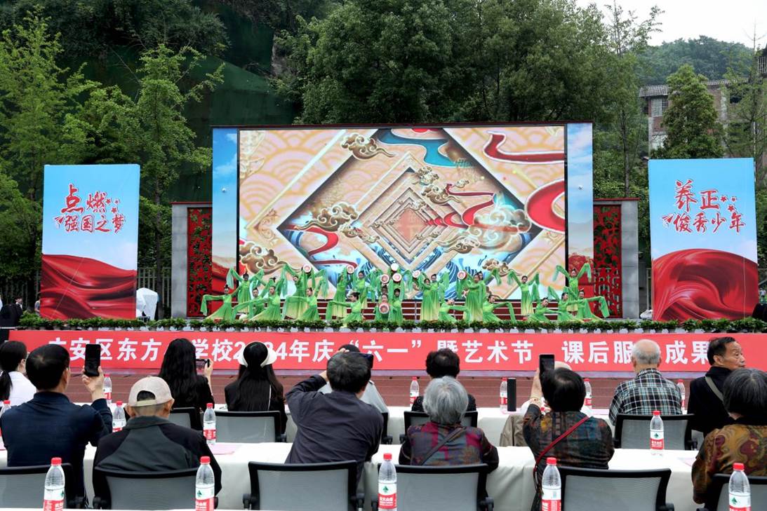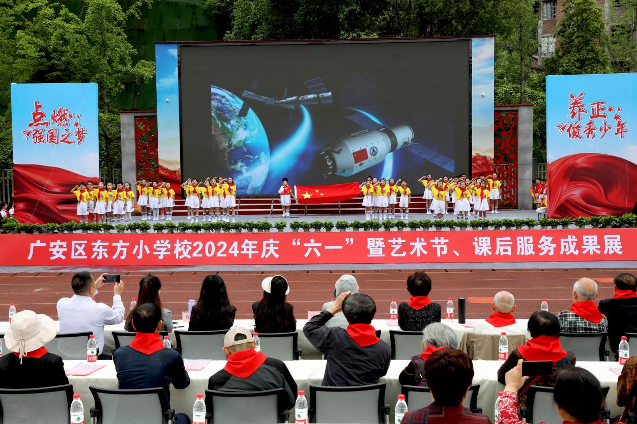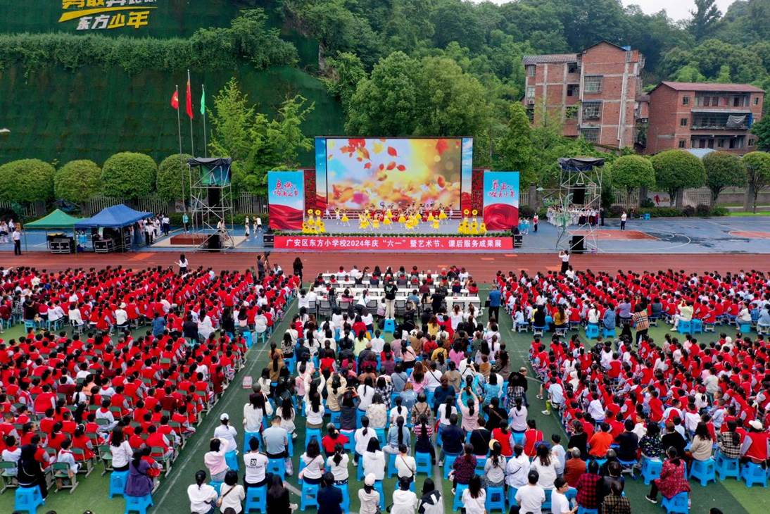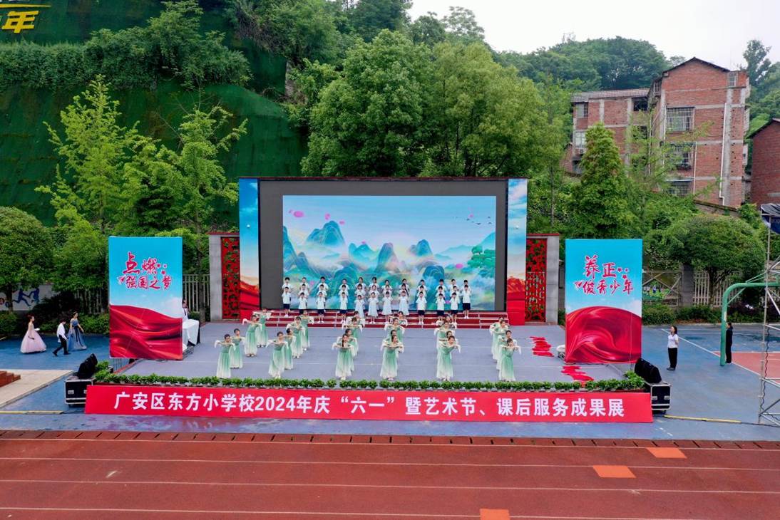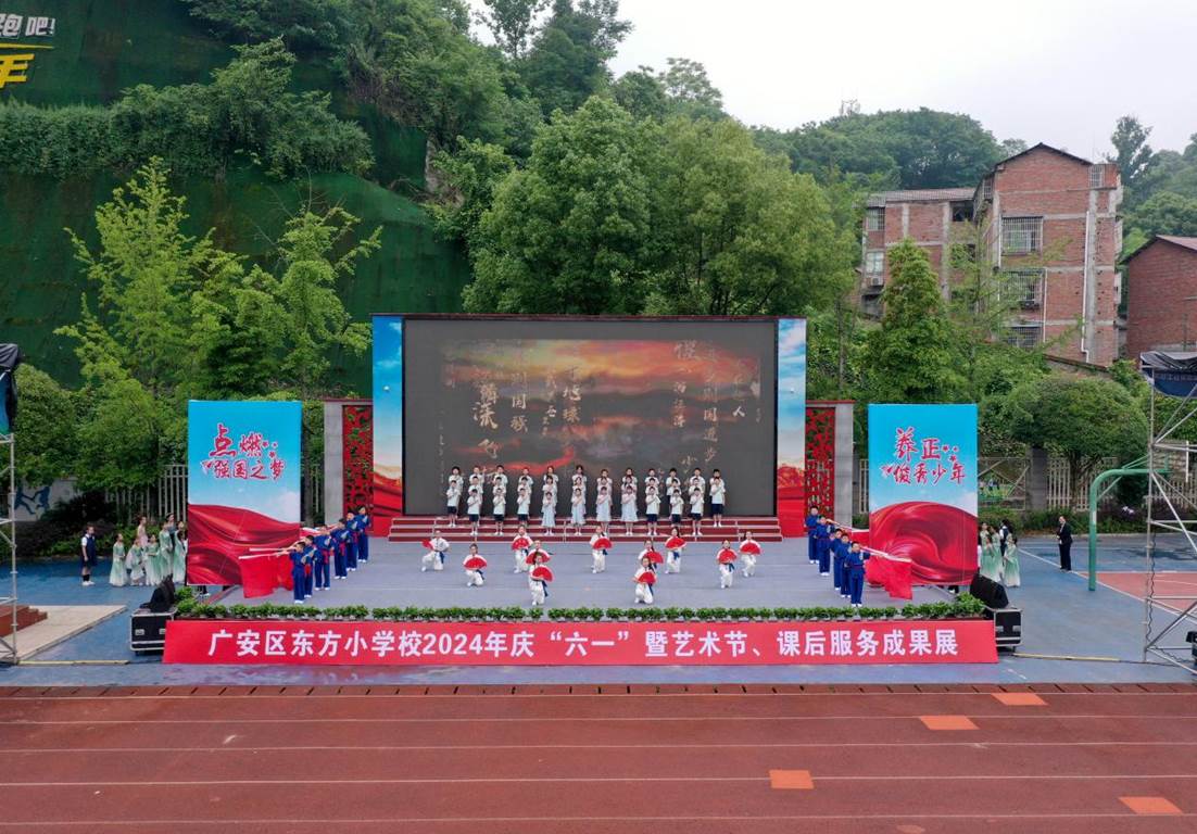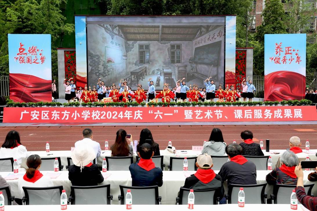 5月30日,在四川省广安区东方小学校园,该校学生正在表演情景剧+舞蹈,点燃强国之梦,展示艺术教育课后服务成果,庆祝一年一度的“六一”儿童节。
