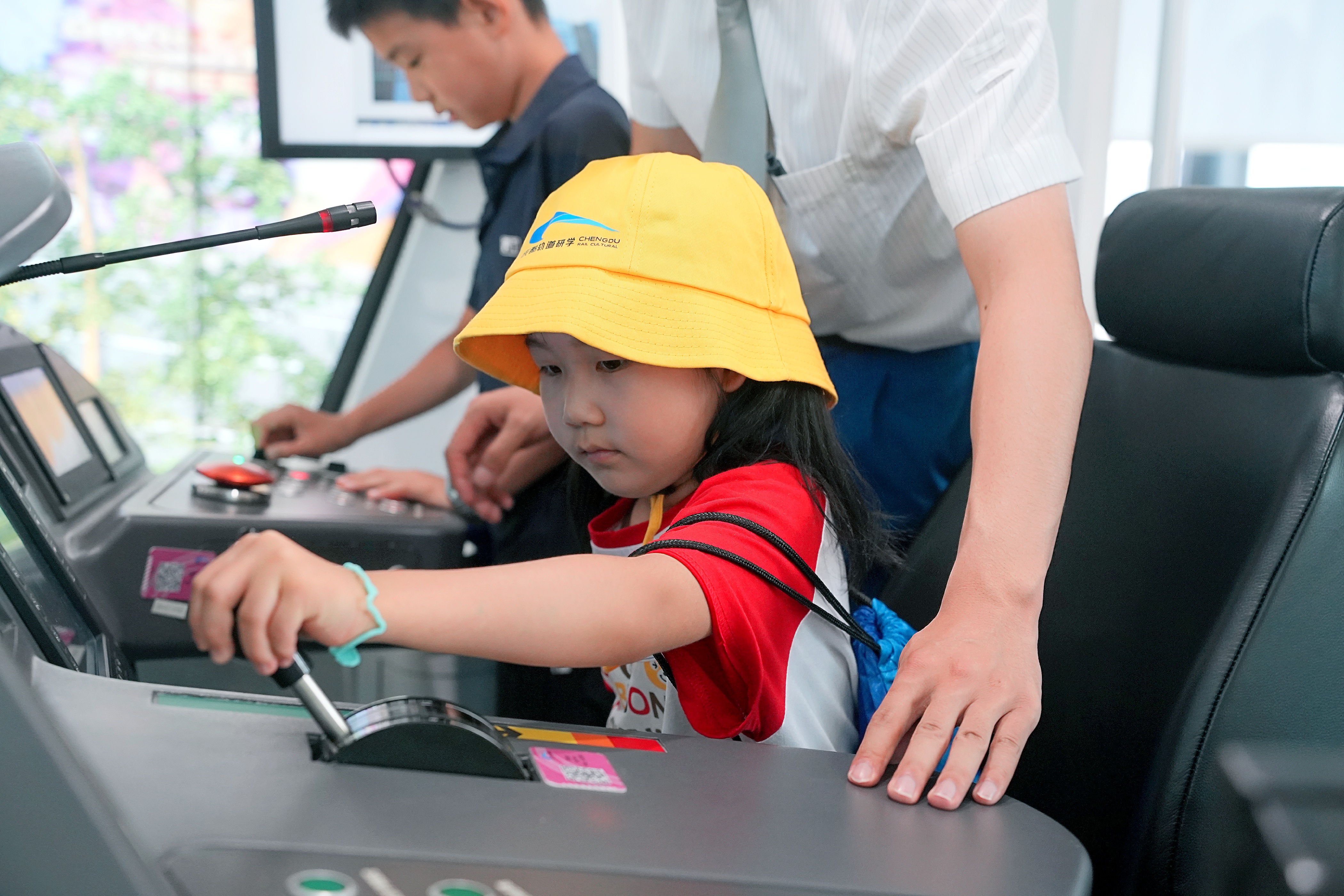 在模拟站台层,小朋友们化身站务员、车辆检修员等,在导师带领下,体验车站接发车作业、站台门故障处理、车辆设备检修的等地铁工作内容;在地铁模拟驾驶室内,小朋友们兴奋地坐上驾驶座,手握操作杆,跟随着导师的指令,时而加速前进,时而减速慢行,身临其境体验驾驶电客车。