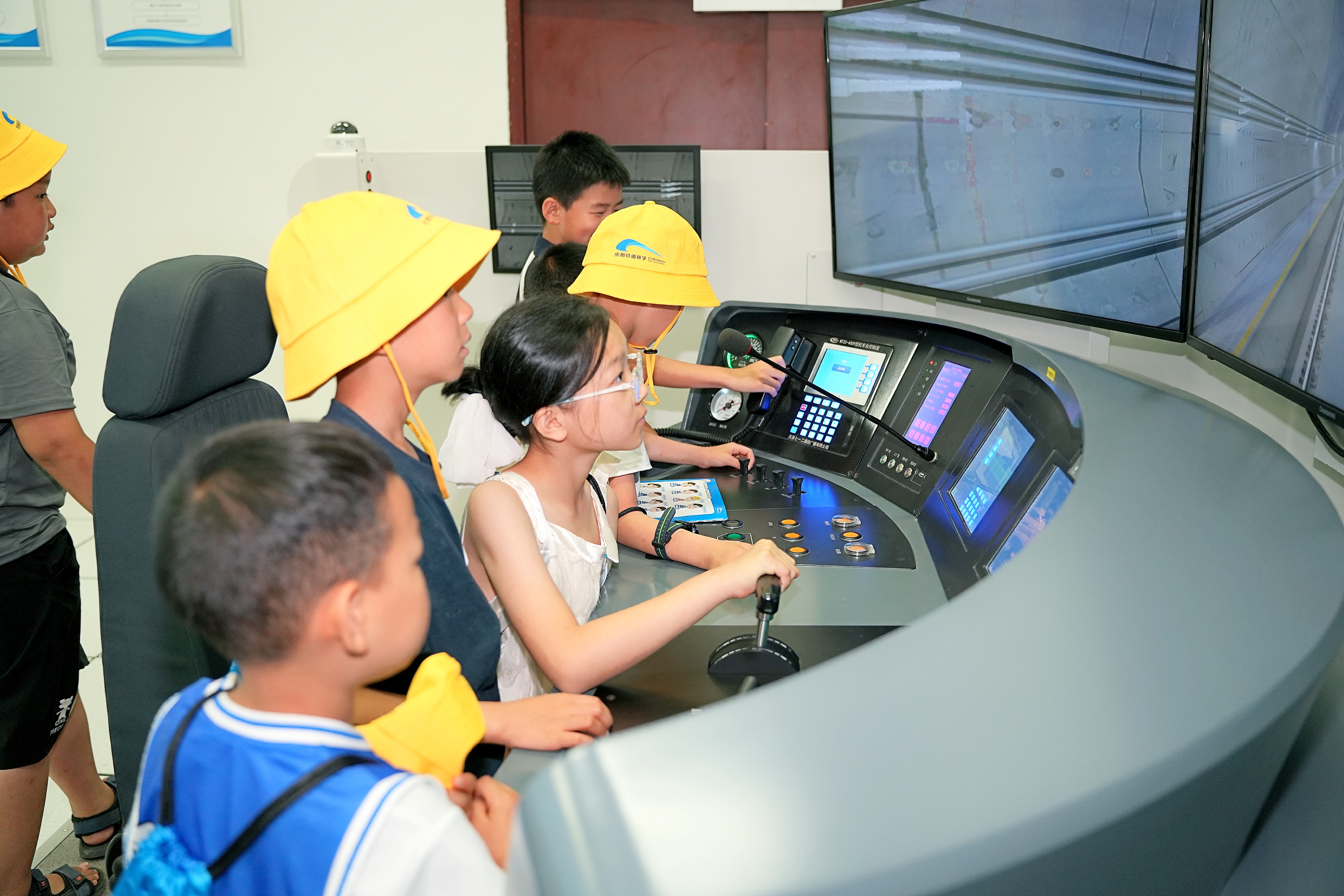 研学之旅第一站是成都轨道交通职业学院培训实训基地。小朋友们在专业导师的引导下,通过实训中心学习了城市轨道交通行车调度、站务、乘务及车辆等专业知识,以全新的视角探索成都地铁。
