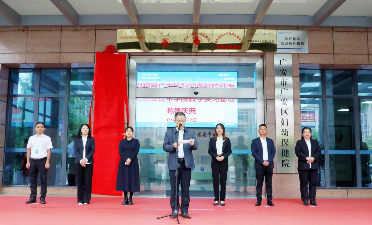 医学院院长杨书琴,副院长贺洪军,广安区卫生健康局党组书记张伟,广安区妇幼保健党支部书记王平,院长王海兵,副院长李萍及有关人员参加揭牌仪式,杨书琴和王平共同为实习基地揭牌。