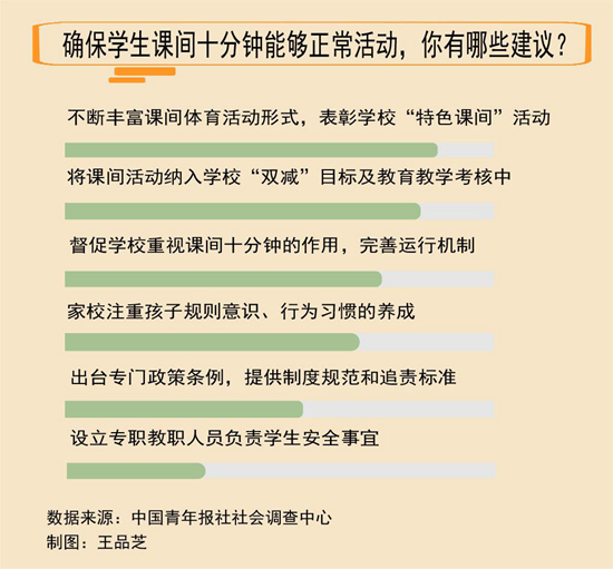 “只能待在教室”“连上厕所的时间都没有”……消失的课间十分钟不断登上热搜,成为大家热议的话题。这两年,相关部门多次倡导学生课间自由活动,但课间十分钟仍难以保障。近日,中国青年报社社会调查中心联合问卷网(wenjuan.com),对1502名家长进行的一项调查显示,56.4%的受访家长觉得孩子在课间十分钟的游戏、社交、运动等活动受限。确保学生课间十分钟正常活动,62.5%的受访家长建议不断丰富课间体育活动形式,表彰学校“特色课间”活动,60.4%的受访家长建议将课间活动纳入学校“双减”目标及教育教学考核中。