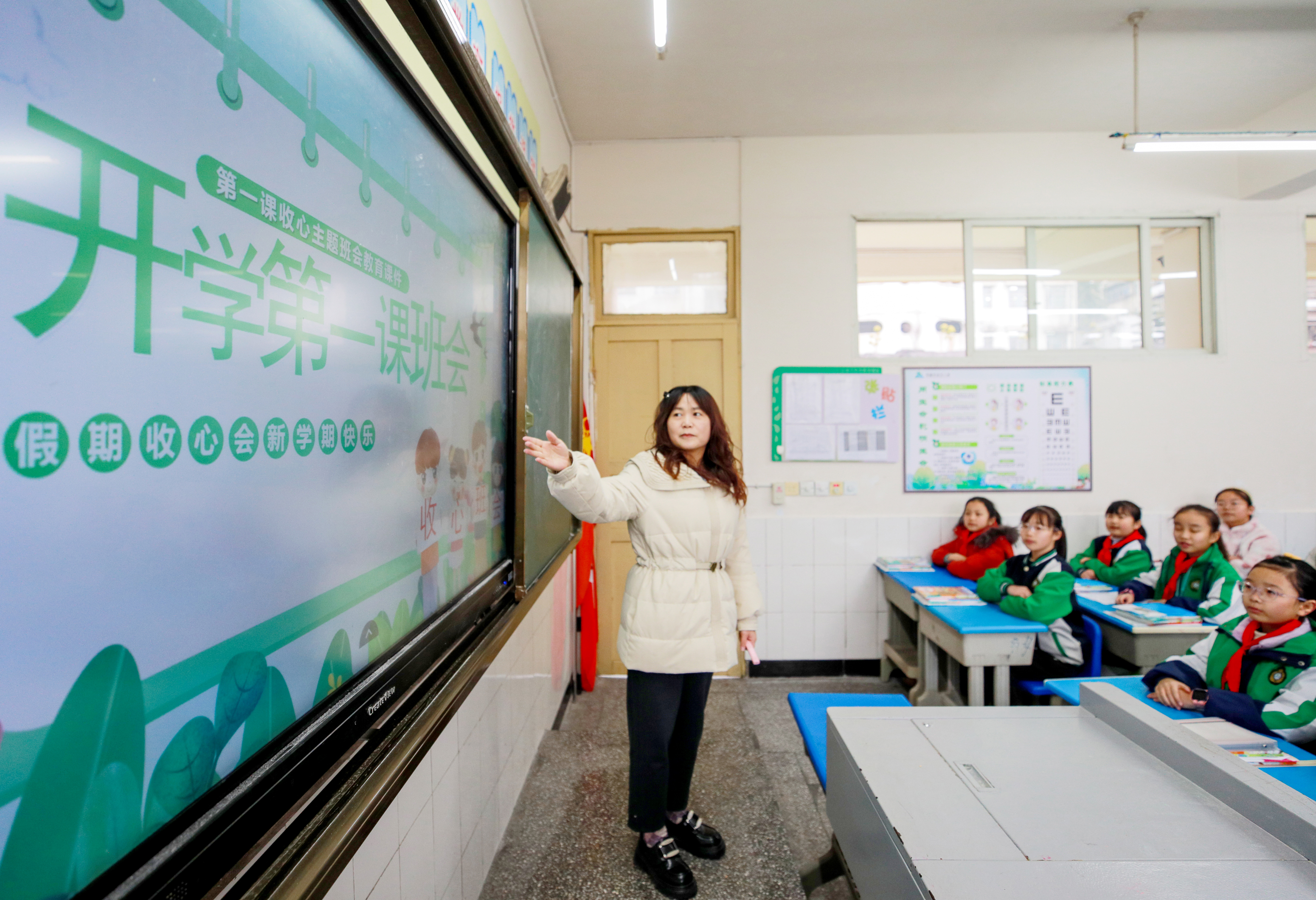 2月25日,四川省华蓥市双河小学五年级的老师在新学期开学第一课主题班会上,给学生讲解思想品德和“爱国主义教育法”等知识。