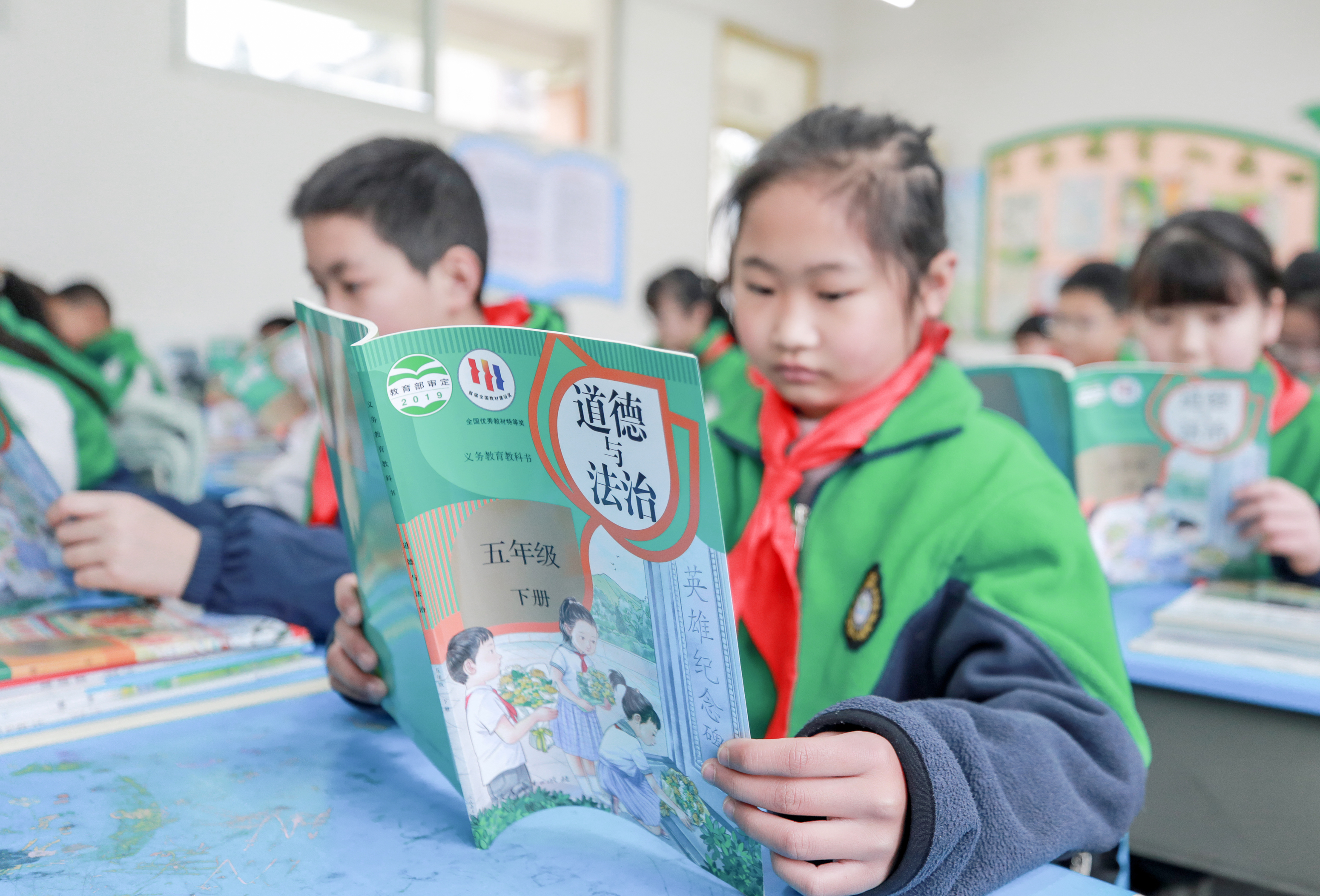 2月25日,四川省华蓥市双河小学五年级的学生在开学第一课上,认真翻阅刚发放的教科书《道德与法治》。