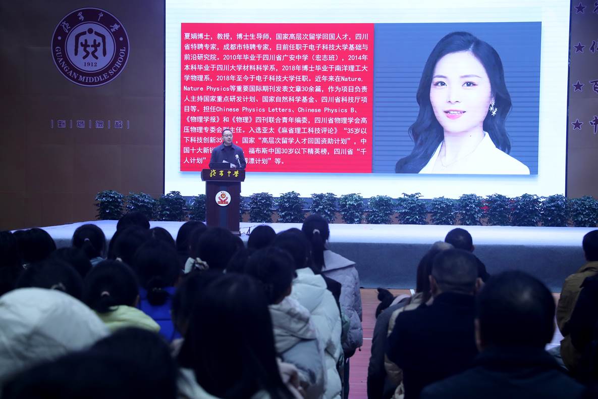 今朝已遂凌云志,鹏程万里有归期。重温师生情谊重,一生不忘母校情。在夏娟校友开始讲座之前,广安中学党委副书记、校长杨松向师生介绍了夏娟的事迹:出生于1994年,现年不到30岁的夏娟2010年毕业于四川省广安中学(宏志班),2014年本科毕业于四川大学材料科学系,2018年博士毕业于南洋理工大学物理系,2018年至今于电子科技大学任职。近年来在Nature, Nature Physics等重要国际期刊发表文章30余篇,作为项目负责人主持国家重点研发计划、国家自然科学基金、四川省科技厅项目等。现在是博士生导师、国家高层次留学回国人才、四川省特聘专家、成都市特聘专家、中国十大新锐科技人物,入选福布斯中国30岁以下精英榜。