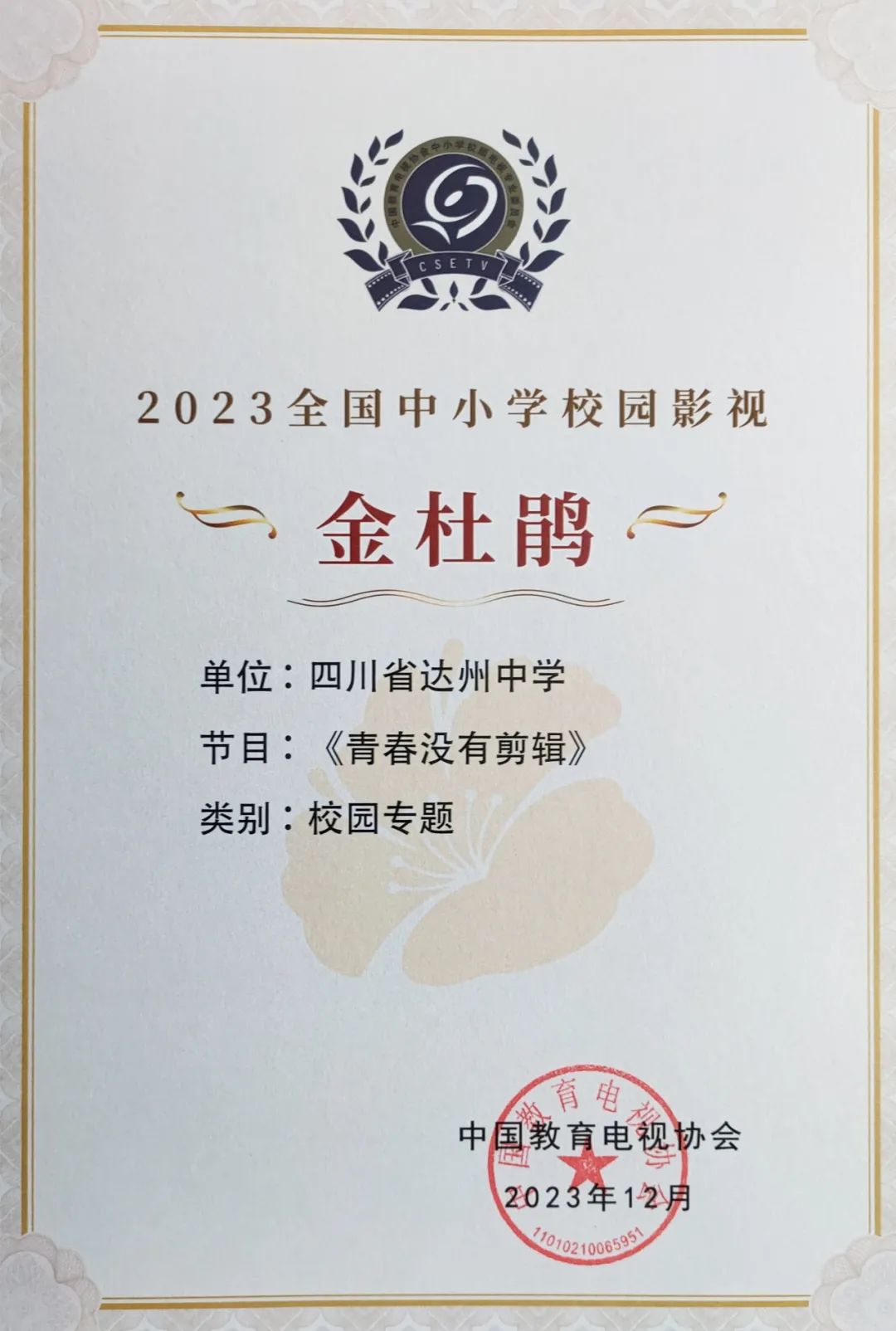 12月26日,2023年全国中小学校园影视展示交流活动在江苏无锡举行,达州中学校园影视作品《青春没有剪辑》荣获校园专题类一等奖“金杜鹃”奖,继达州中学连续三年在全省校园影视教育成果展示交流活动荣获一等奖之后,再在此类赛事活动取得新成绩、新突破。