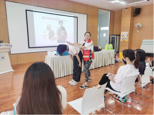 对于幼儿教师来说,异物堵塞可能是幼儿最常见最危险的意外事故了。针对行业特点,红十字的老师专门带我们学习了海姆立克急救法,教会我们如何观察和发现幼儿异物卡喉;当幼儿发生异物卡喉时,如何正确及时的进行应急处置,以免发生更大伤害。