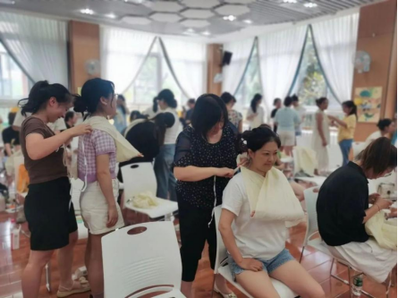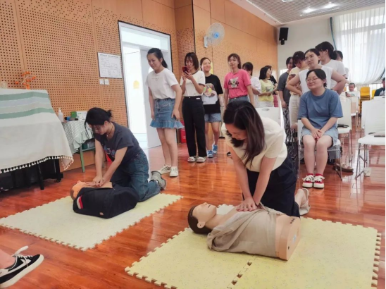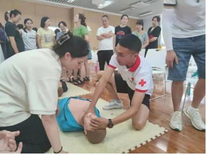 接着,红十字会的老师通过理论培训、案例分享、急救口诀,借助人体模型教具和现场模特实操指导的方式,对心肺复苏(CPR)和多种应急包扎进行了演示和培训。