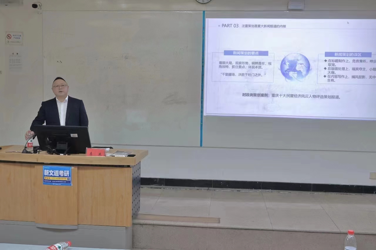 李杰根据马克思主义新闻观原理和党性原则,阐释了记者节的价值与意义、新闻工作者的责任与担当。重点对准新闻工作者——新闻传播学子的未来使命及素质要求、新闻业务能力的培养锻炼等问题,给出了见解和建议。他表示,当今融媒体、智媒体时代,信息传播技术日新月异,新媒体形态层出不穷,但新闻工作者、新闻传播学子不能迷失于媒介技术的追逐,而忘记了新闻专业的初心使命;无论媒介技术怎么发展变化,新闻记者的看家本领还是新闻写作和内容生产,就是以新闻人所特有的新闻敏感、新闻技能和人文素养,写出有深度、有温度、有影响力的新闻报道,这才是新闻记者的核心竞争力。同时,通过“府南河大合唱”“首届重庆十大民营风云人物海选”“‘‘九妹'你在哪里”“蓝色旅途”等都市报新闻策划经典案例,揭示了重大新闻报道中新闻策划的价值和意义;并通过讲述这些经典新闻策划幕后的故事,让大家对新闻策划内容、新闻策划流程、新闻策划要义等,有了直观、整体的了解和把握。