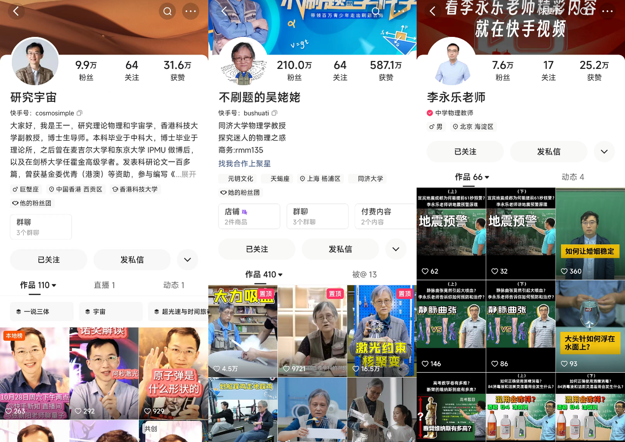 事实上,通过短视频直播的形式,物理学者们将高深的物理学知识讲给了更多人听。在快手上,“不刷题的吴姥姥”“李永乐老师”等众多物理学科普达人组成了快手物理天团,坚持以趣味形式普及物理知识,让更多人燃起对物理的好奇心。