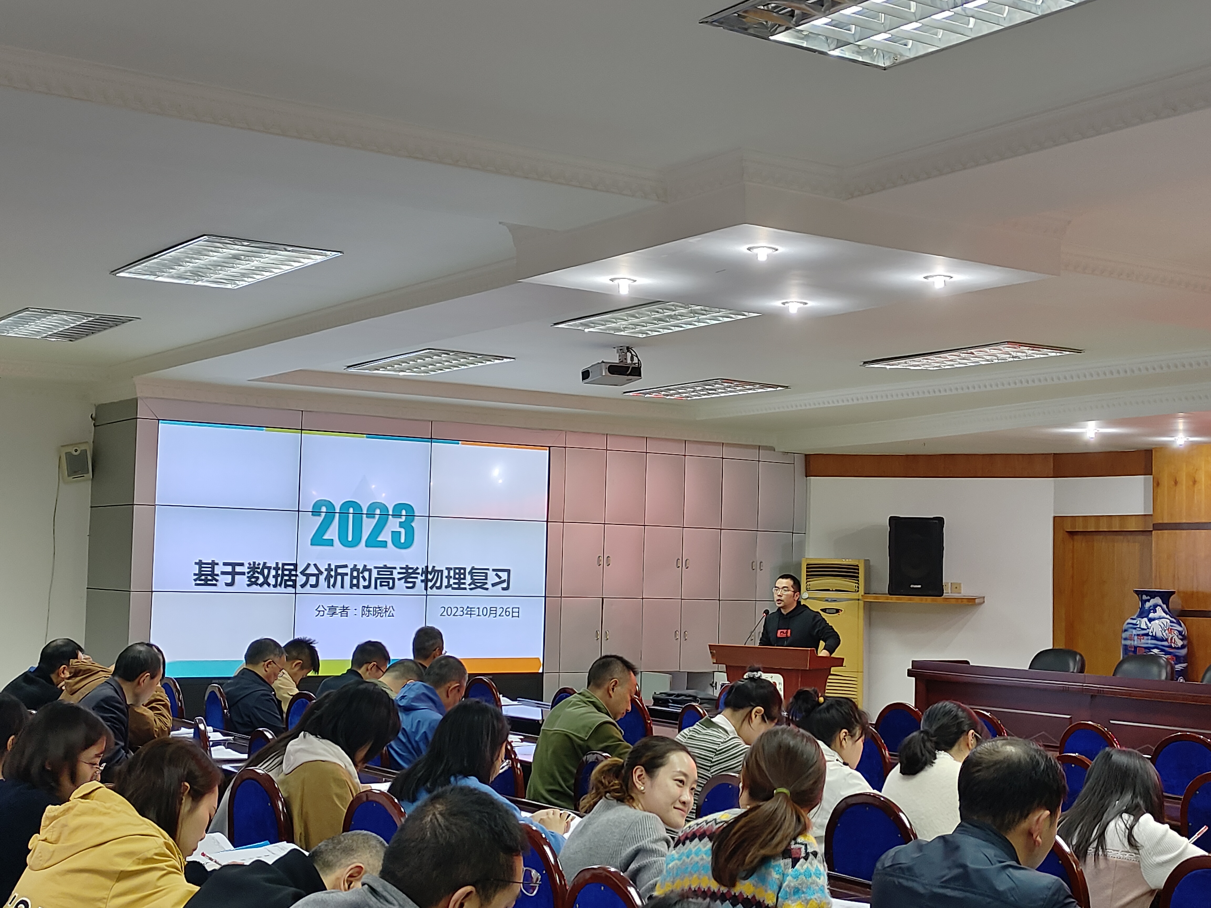 物理备课组组长陈晓松就物理学科的成绩向大家作了经验分享。通过大数据平台所反馈的考试情况,陈老师对学生们的学情作了精准分析。此外,陈老师向大家演示了如何根据数据分析所反馈的问题进行变式练习题筛选,并介绍了物理备课组的周练出题分工及资源共享,强调了集体协作的重要性,认为备课组老师们只有“握紧拳头才会有更强大的力量”。