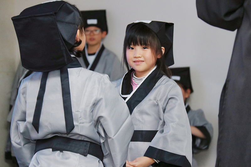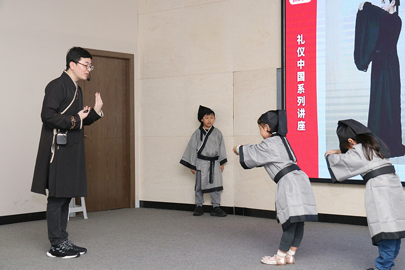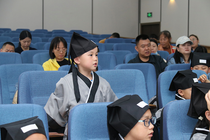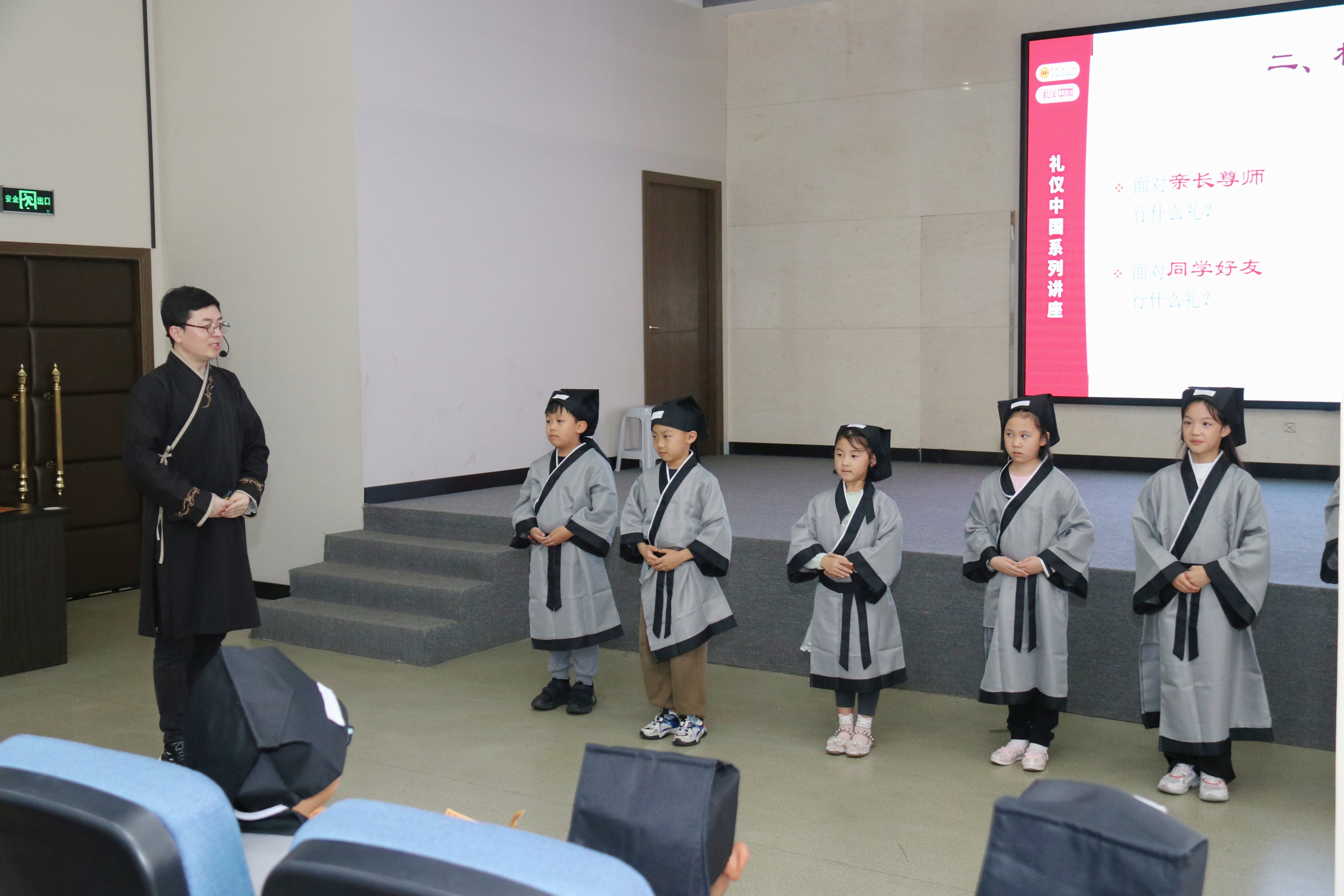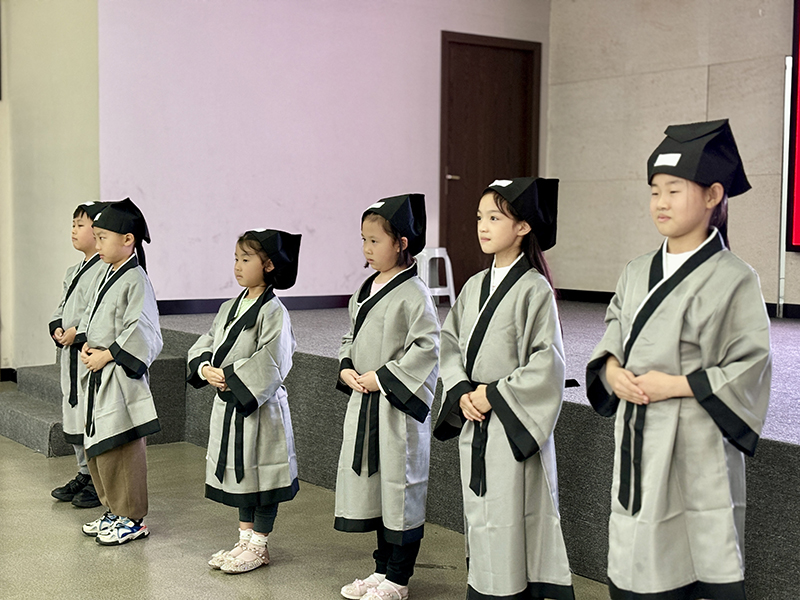 古人云:“童蒙之学,始于衣冠;先正衣冠,后明事理。”穿戴整齐洁净,方能展示一个人良好的精神面貌。小朋友们身着汉服,一个个精神抖擞,在国学礼仪课堂的浓厚氛围下,老师带领大家进行沉浸式经典诵读,从《弟子规》《三字经》到《千字文》,从唐诗到宋词,老师悉心指导学生选择经典诗文篇目进行学习并高声诵读,深刻体会到传统文化的魅力。与此同时,在诵读过程中老师还融入了相应的国学礼仪内容,使孩子们不仅能通过诵读经典温润人生、启迪智慧,也能在潜移默化中理解国学礼仪中的概念,真正做到学有所得,学有所用。