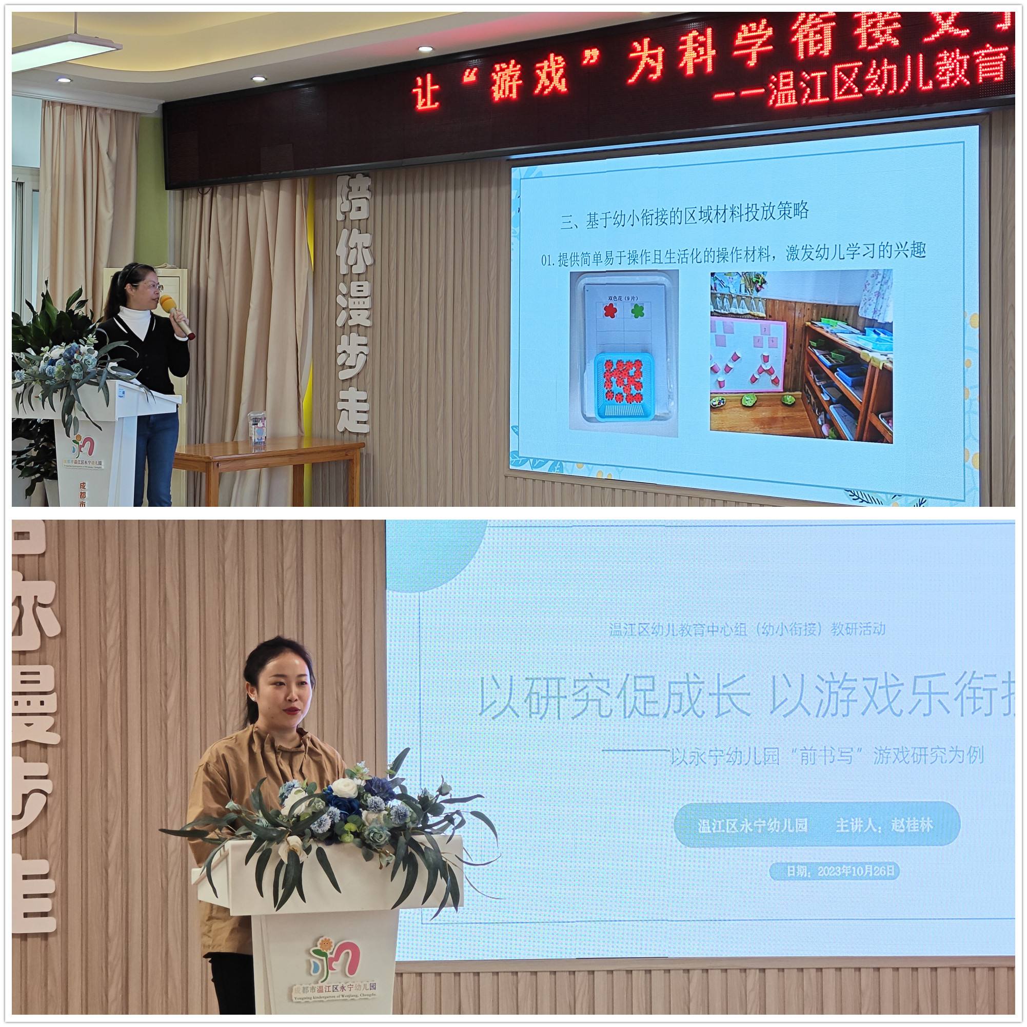 2023年10月26日,结合前期研修情况,聚焦幼小衔接操作小游戏,温江区幼儿教育中心组(幼小衔接)开展线下教研活动,旨在通过大班课例展示,立足儿童视角,探索区分“真游戏”与“伪游戏”,探寻开发拓展游戏的方法与路径,深入探索和挖掘指向学习准备的幼小衔接游戏。本次活动由温江区永宁幼儿园承办,温江区研培中心幼教教研员张含萍老师及温江区幼教中心组二级教研联组(幼小衔接)组员们共同参加。