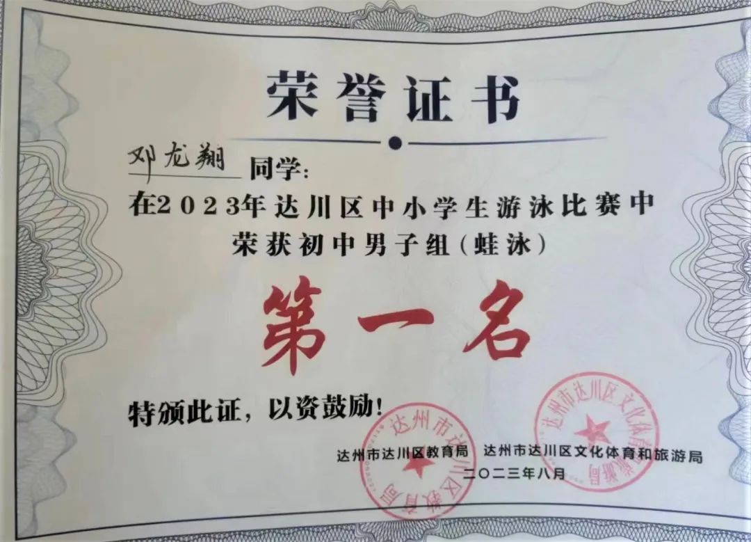邓龙翔同学获得初中男子组蛙泳第一名以及自由泳第二名;