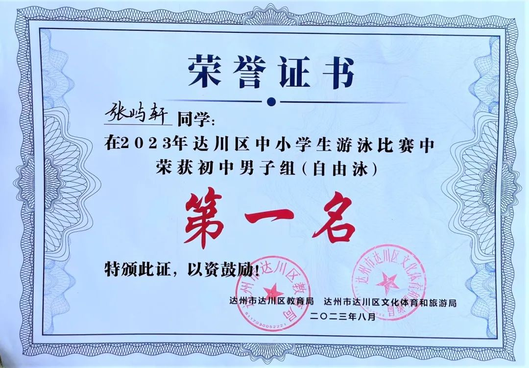 张屿轩同学获得初中男子组自由泳第一名以及蛙泳第二名;