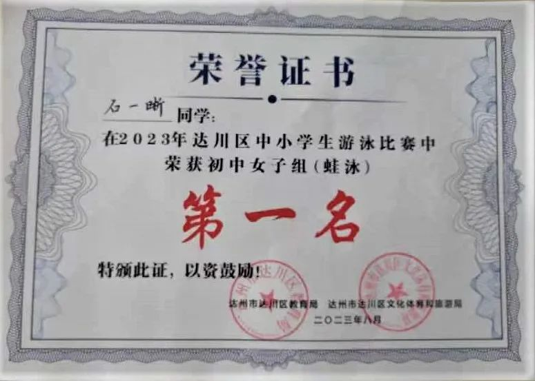 石一晰同学获得初中女子组蛙泳第一名以及仰泳第二名;