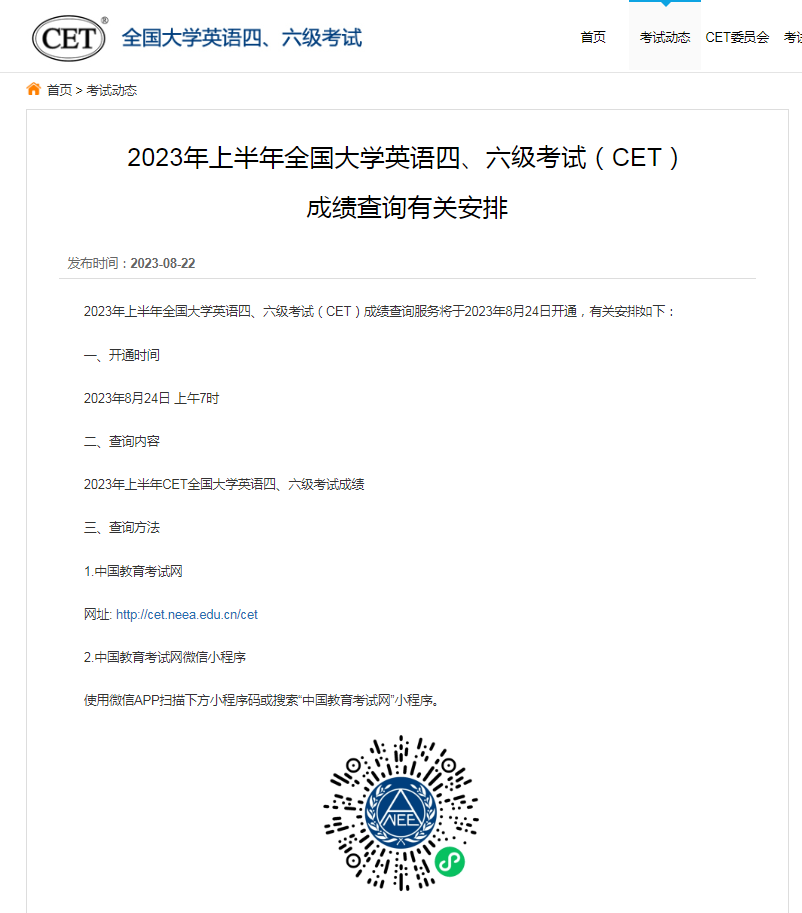 8月22日,中国教育考试网发布消息,2023年上半年全国大学英语四、六级考试(CET)成绩查询服务将于2023年8月24日上午7时开通。