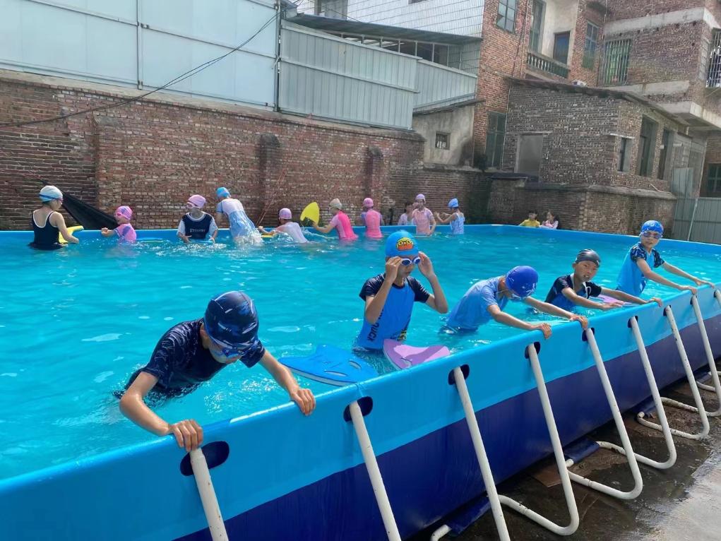 2023年6月6日,湖南省衡山县新桥镇中心完小的游泳课继续进行。(受访者供图) 防溺水不能仅靠口头讲,更要与水安全共处 人民网舆情数据中心发布的《2022中国青少年防溺水大数据报告》显示,因溺水造成的伤亡位居我国0至17岁年龄段首位,1至14岁溺水事故的比例超过40%,青少年溺水问题是一个不容忽视的安全隐患。 东部地区某地级市曾对10个县(市、区)城乡54所中小学6520名学生做抽样调查,发现大多数学生是“旱鸭子”,会游泳学生仅占19%。农村地区学生不会游泳的情况更为普遍。 每到暑期,从组织打卡到奔波家访,从开展宣传到巡视河道,自上而下、方方面面,防溺水的弦都会绷得紧紧的。 提及学校的防溺水教育,湖南省衡山县新桥镇中心完小校长赵勇超脱口而出几个数字:“1-3-5-30”。“1”是指每天必须有1分钟的广播安全提示;“3”是指班主任每天放学时必须做3分钟防溺水教育;“5”和“30”是指每周五放学和节假日前要有30分钟的安全教育。 反复强调下,孩子们将防溺水知识背得滚瓜烂熟。一次,主管教育的副县长来学校,询问一名一年级的孩子“七不两会”是什么,孩子虽紧张,仍流利答出6个。 即便如此,如何让宣传教育真正入脑入心仍是难点。唐欢说:“光靠口头说效果一般,孩子们往往不把大人的提醒真正放在心上。而且他们对于水、对广袤的大自然有与生俱来的喜爱。” 赵勇超说,学校百分之七八十的孩子都是留守儿童,假期很难看管。乡镇娱乐设施少,没有辅导班、兴趣班可以托管,一闲下来,孩子们就可能跑到池塘水库玩水。 仅仅靠“防”远远不够。屡屡发生的溺水事件令越来越多人意识到,让孩子们具备相应的意识、技能,与水安全共处,或许是更好的保护方式。 减少溺亡发生,为农村游泳课教育探路 教育专家认为,暑期溺亡多发,凸显出农村地区普及游泳教育的重要性。衡山县新桥镇中心完小的游泳课教学实践,是农村地区游泳教学的一次破题。 数据显示,以公共泳池为主的中国市场,平均约4.3万人共享1个泳馆。在一些地方,城区内都未建成一个标准的公共游泳馆,农村公共游泳场所更为匮乏。 记者了解到,在不少地方,普及中小学生游泳教育的政策正渐次落地。广东省明确要求,从2020年起,想方设法在小学某一年级开始游泳教育教学;2021年,海南省更是要求“全省小学毕业生要全部学会游泳”。 场地设施的增加,也在为孩子们提供更多安全的游泳去处。近期,由国家体育总局等12部门发布的《关于推进体育助力乡村振兴工作的指导意见》明确提出,推动解决青少年游泳等场地设施不足问题。 在唐欢看来,他搭建的泳池条件简陋,清理消毒也只能靠自己或家人加班完成。然而,这种方式投入低、管理简单,可用最小成本实现目标,便于在乡村范围内复制推广。当然,这类实践能否落地,往往取决于行动者的勇气与坚持。 作为学校的第一责任人,赵勇超校长也有过顾虑。2022年,当地教育部门提出,各地各学校要充分发掘潜力开展游泳教学训练,学校终于找到可靠的政策支持。 赵勇超说,当前在农村学校普及游泳课,要具备几个条件:一是要有唐欢这样有教学资质的老师;二是学校要有相应场地并确保安全;三是学校和老师要有情怀,愿意承担风险。 尽管每天都悬着一颗心,但看到一百多个孩子能成功游上岸,唐欢觉得很有成就感。 至今令赵勇超印象深刻的一个画面是,6月份下了场暴雨,放在学校里的浮漂都被冲走。唐欢冒着大雨跳进水里,把浮漂一个个捞了回来。看着他的背影,赵勇超的眼眶一下红了。“如果所有人都能像唐欢一样,就没有什么事是做不成的”。