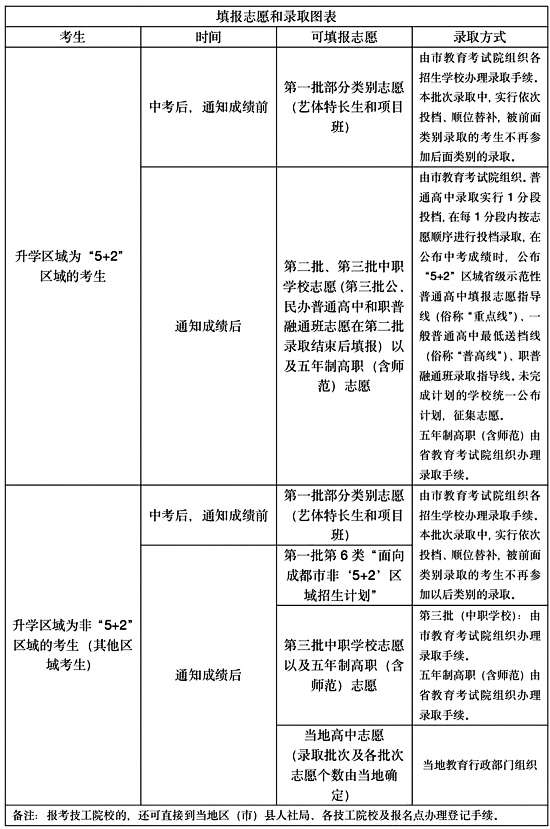 需注意的是,今日还会同步公布“5+2”区域省级示范性普通高中填报志愿指导线(俗称“重点线”)、一般普通高中最低送档线(俗称“普高线”)、职普融通班录取指导线,请考生家长关注。 成都市教育考试院提醒:考生查询的中考成绩不包含按政策规定享受的各类加分,考生在填报志愿时,应将自己的加分考虑在内。考生如果对本人成绩有疑问,可向就读初中学校(或者报名点)提出复核申请(截止时间6月29日10∶00),市教育考试院将帮你认真核查。 成绩出炉后,志愿填报工作也该提上日程了。根据教育部和四川省有关要求,2023年成都市考生全部在统一的志愿填报系统上填报志愿,实现填报志愿方式统一、数据标准统一。今年成都市中考志愿填报通过“成都招考”进行,正式志愿填报期间,考生凭本人账号和密码登录“成都招考”,进入“志愿填报及录取查询”完成各类志愿填报。 按照时间安排,6月28日中午12点志愿填报系统正式开启。除此之外,关于中考志愿填报有哪些关键信息需要注意呢?我们已经为你整理好了! 志愿填报时间咋安排? 考生家长需要注意,成都市中考志愿是分区域填报。具体来说就是分为“升学区域为‘5+2’区域的考生”和“升学区域为其余招生区域的考生”。 其中按相关安排,两个区域、符合条件的考生已在规定时间完成了第一批次第5类“艺体特长生”志愿、第一批次第4类“丘成桐少年班、校园足球班、排球及篮球预备队”和第7类“部分‘5+2’区域高中学校的项目班招生计划”的志愿填报。 除此之外,志愿填报时间具体安排如下: 1、升学区域在“5+2”区域的考生 6月28日12∶00—6月30日12∶00 考生网上填报公办和民办普通高中志愿、中职学校志愿以及五年制高职(含师范)志愿。 7月7日9∶00—7月8日10∶00 第三批次志愿填报。市教育考试院将统一公布第三批次公办、民办普通高中可执行计划,未被第一、二批次录取的考生网上填报第三批次学校志愿。此次志愿填报时,考生如未在规定时间内对6月28日12∶00—6月30日12∶00期间填报的第三批次志愿进行修改和确认,系统将以前次填报的志愿为准。 “集中补录”志愿填报 第三批次普通高中录取结束后,市教育考试院将统一公布本次可填报公办、民办普通高中学校及可执行计划,未被录取且符合条件的考生网上填报本次学校志愿。具体填报时间另行通知。 2、升学区域在其余区(市)县的考生 6月28日12∶00—6月30日12∶00 完成“5+2”区域部分普通高中“面向成都市非‘5+2’区域招生计划”、中职志愿以及五年制高职(含师范)志愿,以及按当地要求填报当地高中学校志愿。 每个批次录什么?怎么录? 按照政策,中考录取分为“5+2”区域和其他招生区域。 “5+2”区域考生的志愿分为三个录取批次: 第一批录取类别,按先后顺序分为7类,依次是:第1类“高层次人才子女、符合条件的新冠疫情防控一线医务人员子女”;第2类“青少年航空实验班”;第3类“指标到校生”;第4类“丘成桐少年班、校园足球班、排球预备队、篮球预备队”;第5类“艺体特长生”;第6类“面向成都市非‘5+2’区域招生计划”;第7类“项目班”,包括公办、民办普通高中项目班。本批次录取中实施依次投档、顺位替补,被前面类别录取的考生不再参加以后类别的录取。 第二批录取类别包括省级示范性普通高中,经批准的公办、民办普通高中。 第三批录取类别包括市级示范性普通高中、一般普通高中、民办普通高中、职普融通班、中职学校。该批次录取由成都市教育考试院组织。需注意的是,该批次一般普通高中、职普融通班录取、征集志愿结束后,市教育考试院将组织一次集中补录。 其他招生区域的录取批次和录取工作都由当地教育行政部门确定和组织。此外,五年制高职(含师范)计划面向全市招生,单设志愿、同时填报,由省教育考试院组织录取。 这么多批次可填报的志愿,对应怎样的录取方式?谁可报?填报时间需注意什么?来看下面的一图读懂! 没收到成绩短信?还可以这样查成绩! 6月28日10∶00,市教育考试院将通过短信向考生(未准确填报手机号的除外)发送中考成绩。若没有收到成绩,考生还可通过以下渠道获知自己的中考成绩(不含加分): 1、微信公众号查分。考生进入微信公众号“成都教育发布”(微信号:cdsjyj),点击“综合服务”,再选择“中考查分”。 2、微信小程序查分。考生可关注“成都招考”微信订阅号(微信号:cdzk789),点击菜单栏“升学工具—中考成绩查询”进入小程序进行中考成绩查询和中考成绩单(加盖公章并设置了防伪验证二维码)下载。 3、“成都招考”查分。考生登录“成都招考”(访问https://online.cdzk.org或https://online.cdzk.com,进入“成绩查询”查询、打印本人成绩,也可在“个人中心”中的“我的消息”查看本人成绩。请选择适当的时间查询、打印自己的成绩,尽量避开高峰期,以免造成网络拥堵。 填报志愿 这些细节很重要! 中考志愿填报在即,除了对比分数填报到理想的学校外,有些细节千万要注意,以免影响自己的志愿填报! 提交保存不要忽视 考生须在规定时间内进入志愿填报系统,可以反复填报、查看、修改志愿。网上填报志愿时间截止后,不能再登录、修改志愿。各招生区域均以正式填报志愿阶段考生网上填报的志愿为准。考生在填报和修改志愿时一定要在提交成功后才退出系统,确保