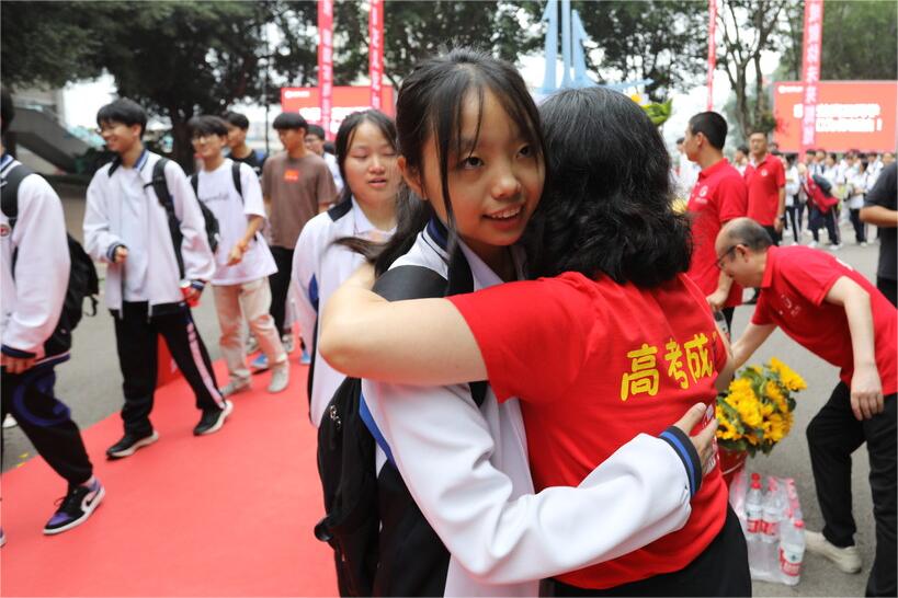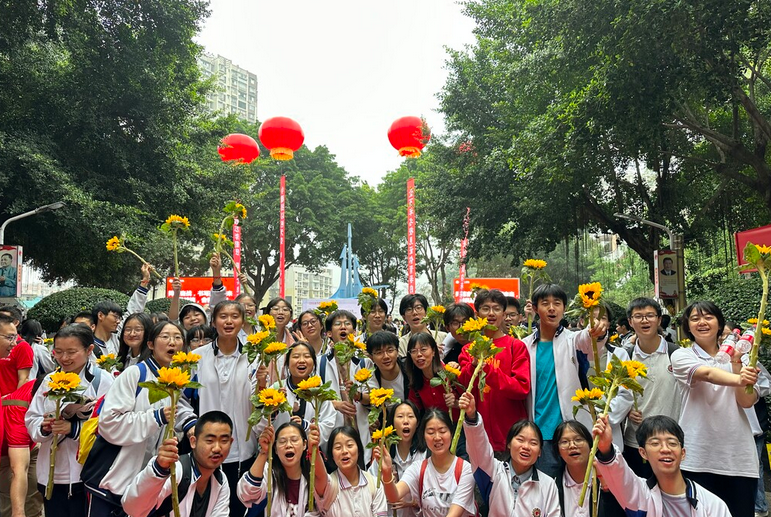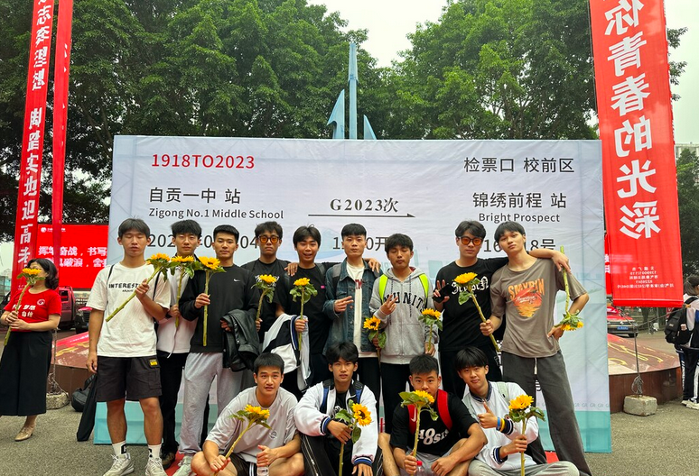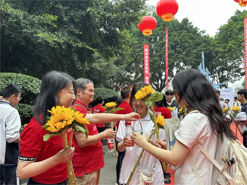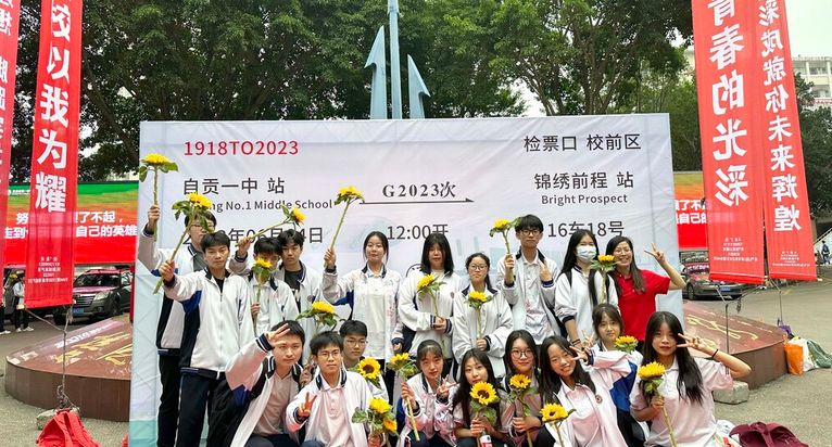 当日,自贡一中举行“一举夺魁”2023年高考壮行活动,老师们身着红色送考服,在学生离校路上击掌、拥抱,送出向日葵,祝孩子们梦想成真。“我们提前准备了1000朵鲜艳的向日葵,发给每一名离校的高三学生,祝大家一举夺魁;制作了专属学生的创意火车票,把起点站、终点站、毕业日期、车次等巧妙地组合在一起,希望毕业生把高中生活的结束当作人生新起点,祝福大家更上一层楼。”自贡一中学生发展中心主任王奇介绍道。