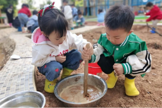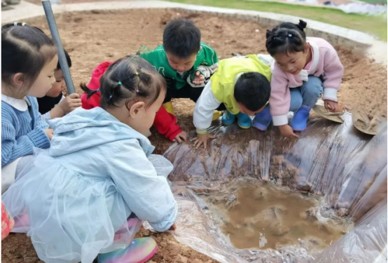 游戏中,幼儿们用碗、大盆装泥和水,并默默观察加水的情况。老师在分享环节中提出,小朋友们觉得在泥池里面需要加多少水呢?面对老师的提问,幼儿们各抒己见,期待着下次游戏的验证结果。