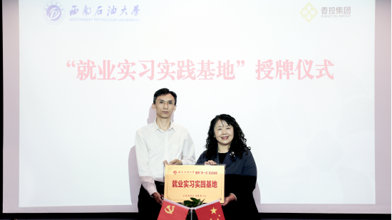 西南石油大学党委副书记、工会主席衡彤同志(右),香投集团党委副书记、纪委书记邱志春同志(左)举行授牌仪式