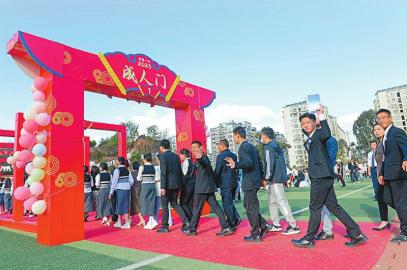 4月2日,在西昌市西昌一中成人礼上,家长带领学生走过“成人门”。