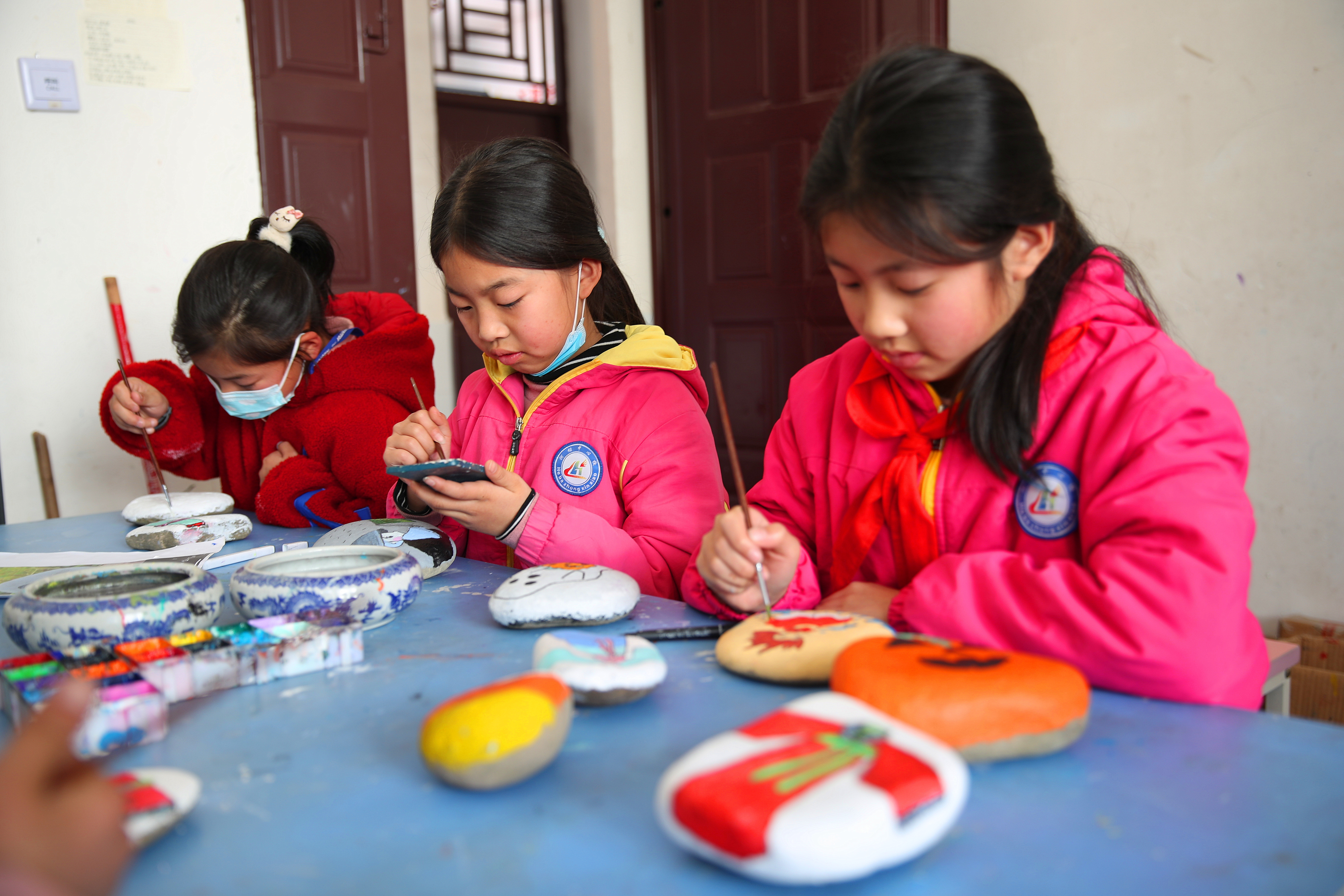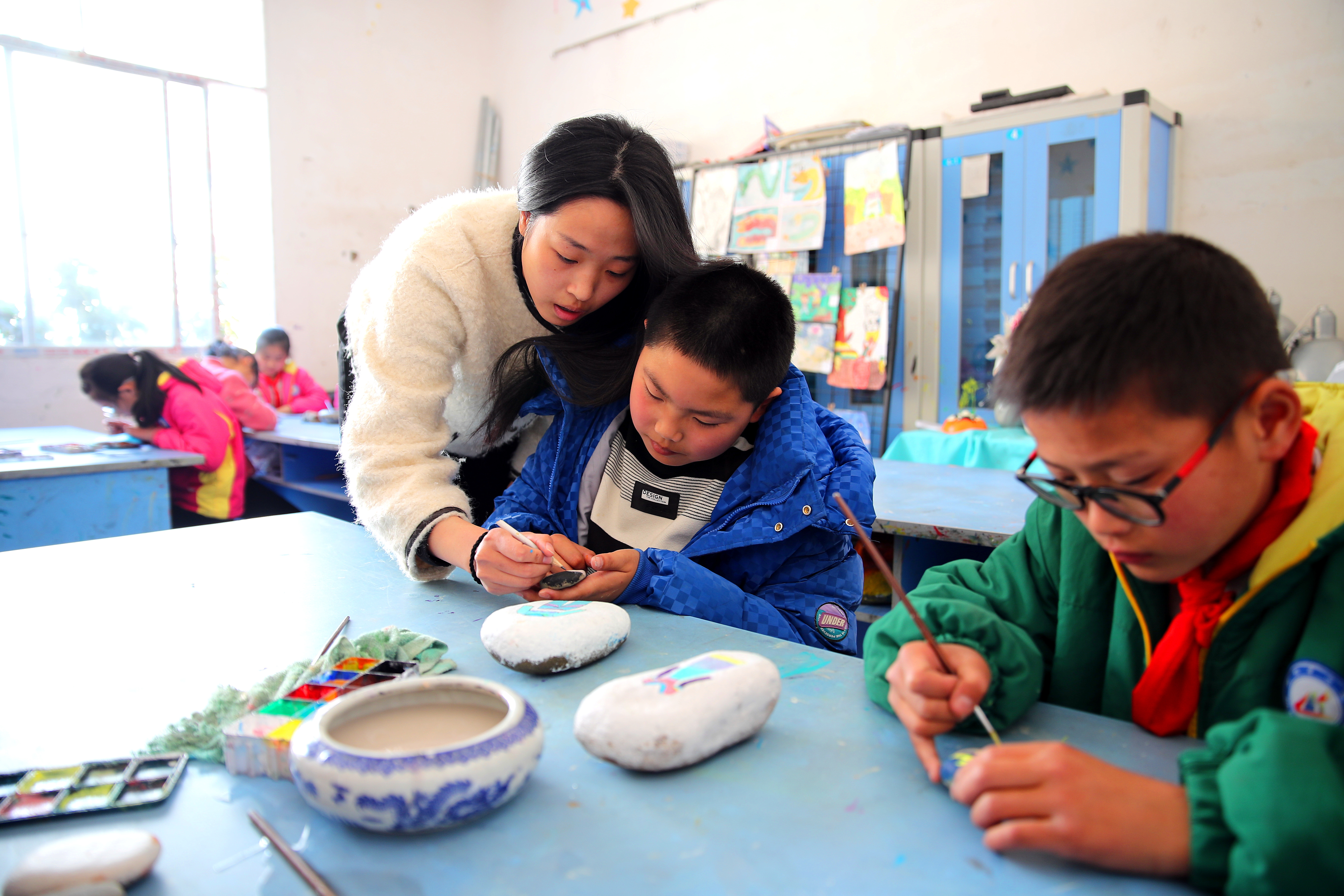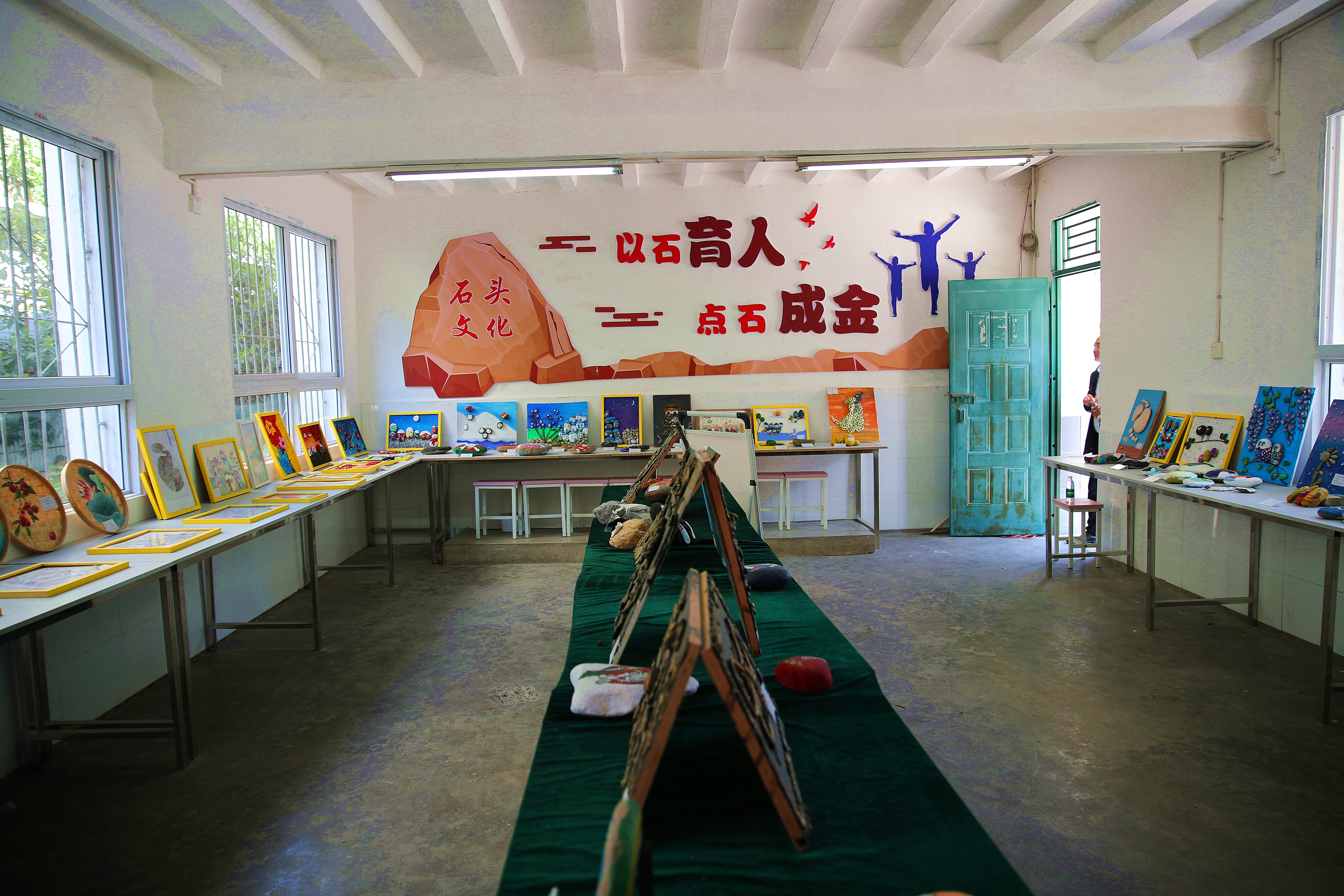 在美术室,学生们正在老师指导下,在石头上作画,一块块形态各异的石头,在学生的精心绘制下,变成了一件件精美作品。进入学校石文化作品陈列室,一件件石头作品映入眼帘,让人目不暇接、叹为观止。