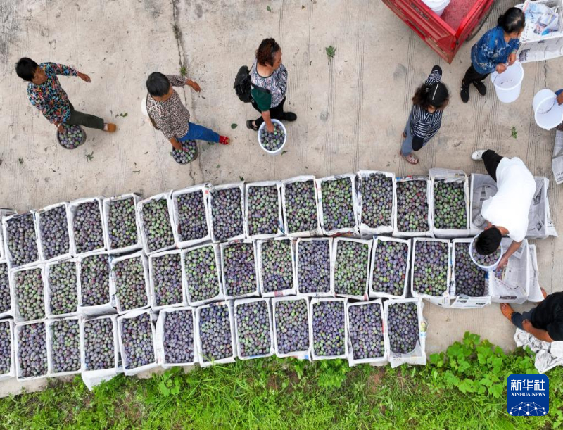 6月14日,四川省遂宁市船山区唐家乡万福村村民将采摘的李子装箱(无人机照片)。新华社发(刘昌松 摄)