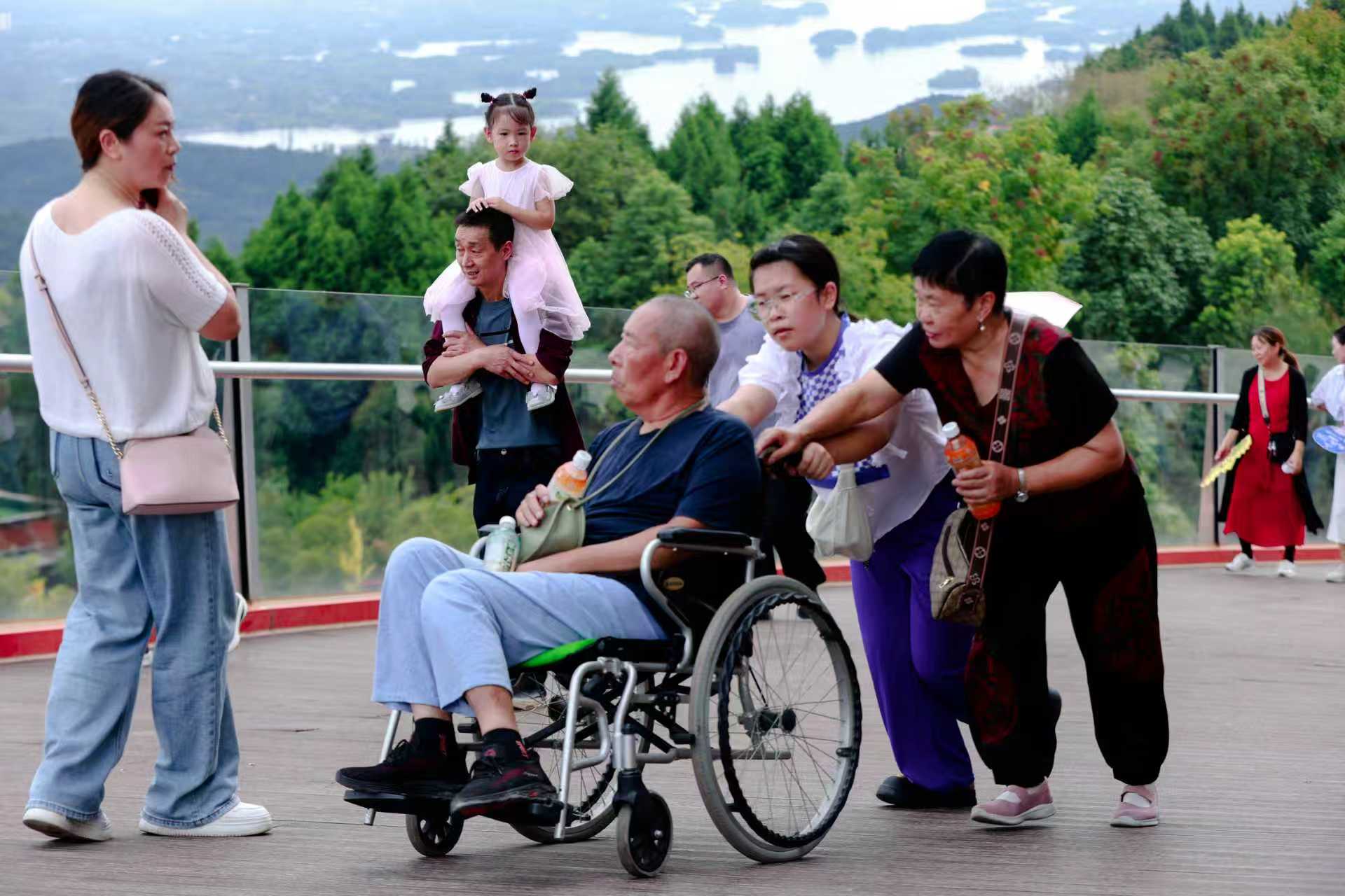 国庆与中秋双节叠加而至,各地景区人潮涌动,一片热闹景象。在四川省资阳市雁江区丹景山观景台处,远山如黛、湖泊似镜,自然美景宛如一幅天然画屏铺展眼前。而在这画屏之下,一幕温情画面悄然上演,它既是团圆佳节的生动写照,更是中华孝道代际传承的鲜活见证。