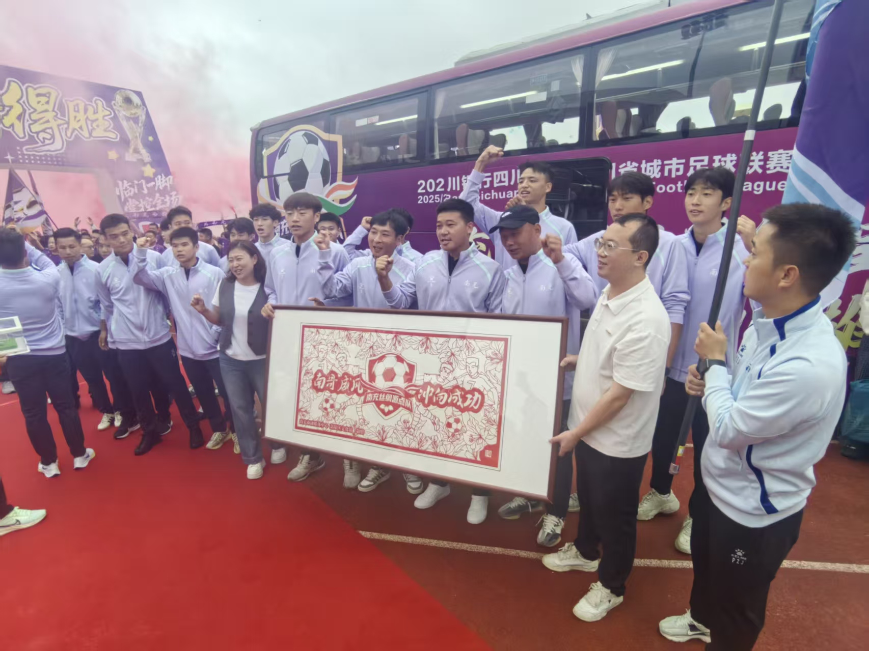 出征仪式上,首先播放了出征运动员相关视频,以此展现运动健将们训练比赛时的飒爽英姿。随后,球队队员逐一亮相,他们牵着可爱的小球童依次走过“壮志凌云”门。同时,起源于清代、已有300余年历史的国家级非物质文化遗产川北大木偶表演队也来到现场助威。现场球迷激情高涨,“南充丝绸源点队征必胜”的呼喊声不绝于耳。