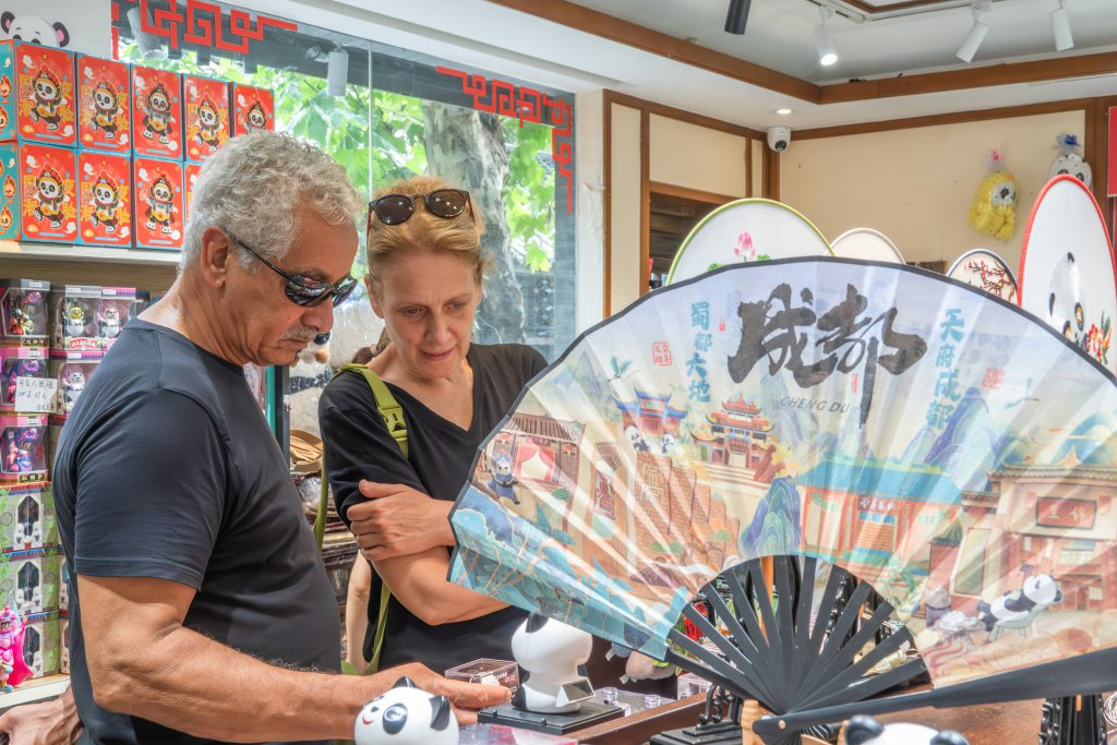 8月2日,外国友人在成都宽窄巷子挑选熊猫装饰品。 邓显杰 摄 (C视觉)