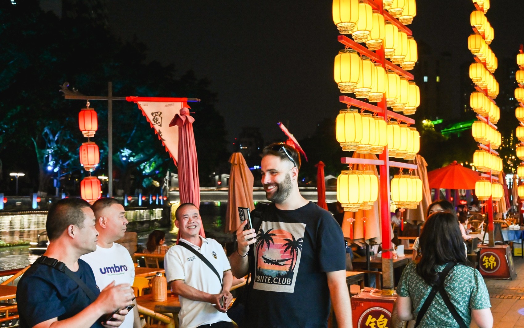 8月4日,夜幕下的成都锦江,华灯初上。来自德国的汉娜与家人漫步在东门码头,身着汉服的工作人员正引导游客体验投壶、捶丸等传统游戏,不远处的乒乓球挑战区传来阵阵欢呼声——这场古今运动的“隔空对话”,让她忍不住举起手机记录:“成都的活力让我着迷。”在乘船夜游时,两岸光影勾勒出“窗含西岭千秋雪”的诗意,汉娜和孩子不时为岸边的川剧变脸、民乐演奏喝彩。